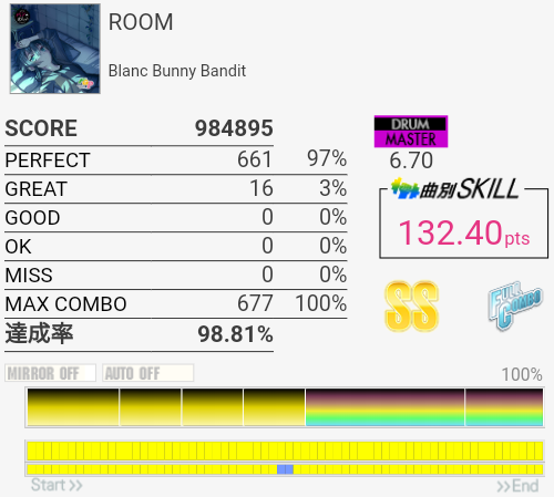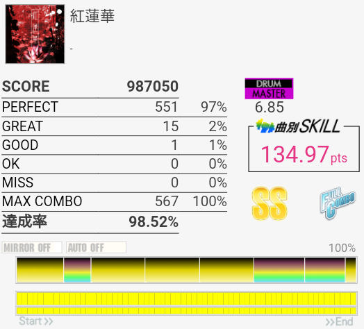 「ぐれんげ」と読むらしい。鬼滅の刃はさすがに知ってるけど読んだことないしアニメも見たことないので曲も知らない。原曲はLiSAが歌っているらしい。譜面はこの難度値でも簡単めだけどAメロ終わりの手が裏入りになるフィルがちょっと見辛い。でもいい譜面だね。
