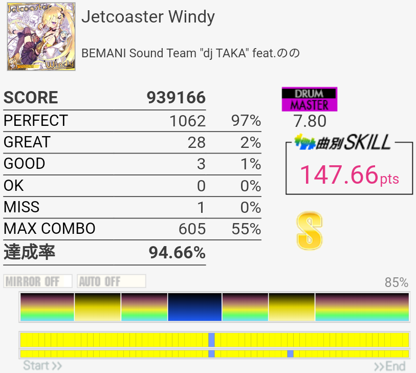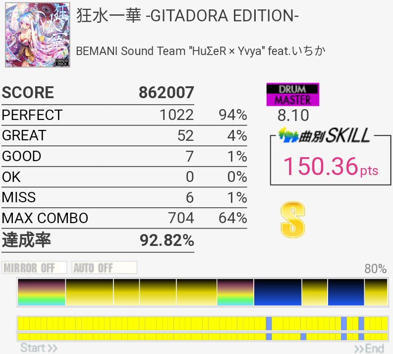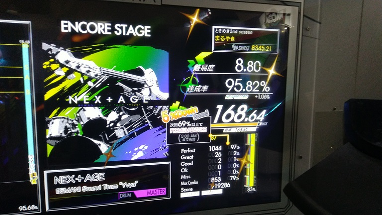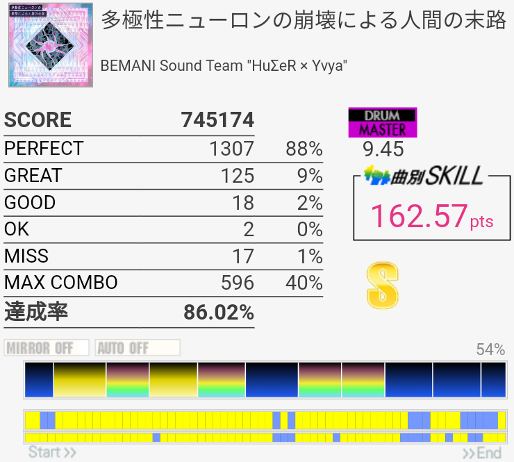リザルトスクショし忘れたけど写真撮っててよかった。曲めちゃくちゃカッコいい!譜面的にはFractusを少しだけ難しくした感じなのでこの難度値だとけっこう逆詐称、だけどLT×2→FT×2→SNの形が何回か来たり終盤の三連符混じり?の連打がよくわかんなかったり、あと単純にBPMが速くて手数が多いのでミスしやすい。