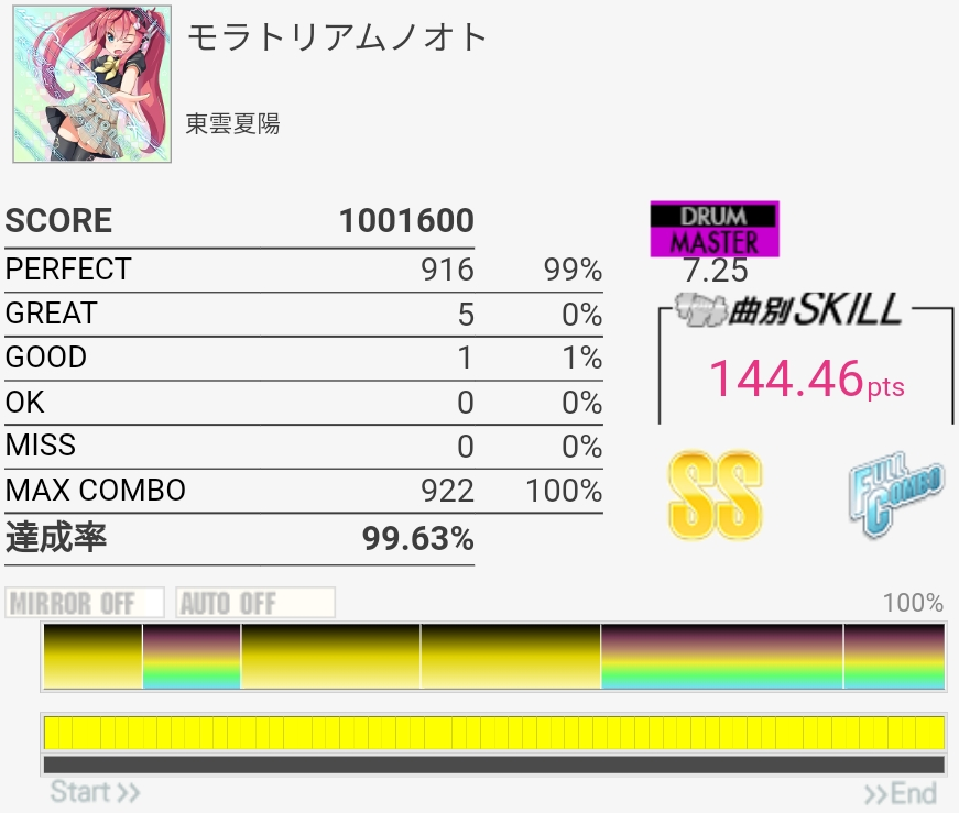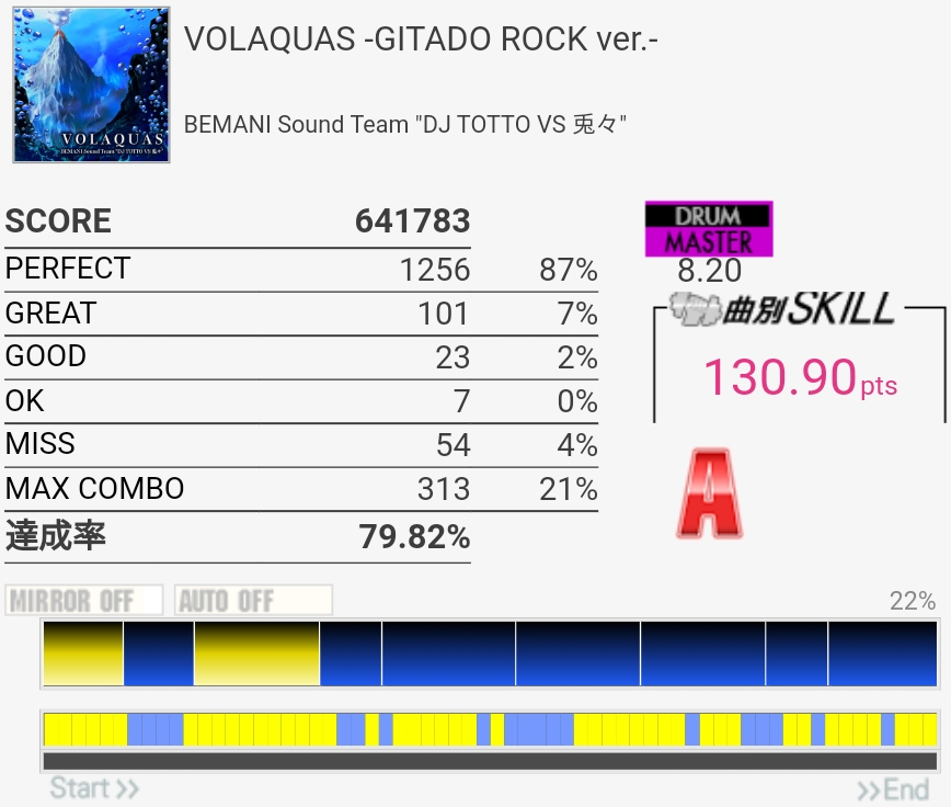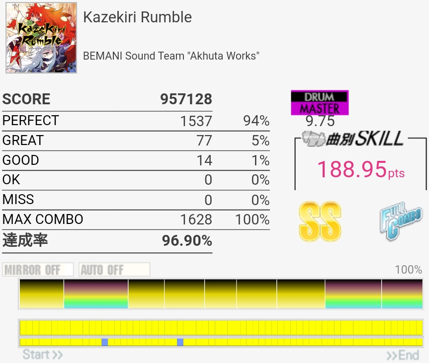 難度値はおいておいて、譜面自体意地が悪いというかいちいち左右に振り回すのでキッツいっすね。三連譜ツーバスのところを取れればS判定は出そうだけど……このBPMを捌くのってもはや才能の世界な気がしちゃうなあ。