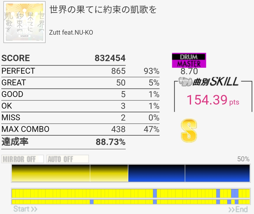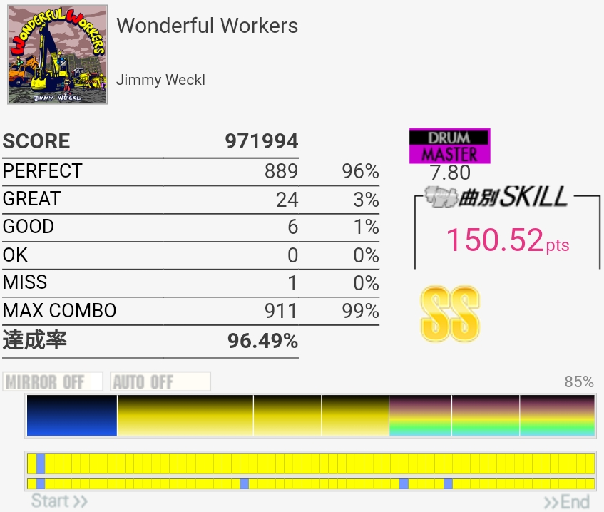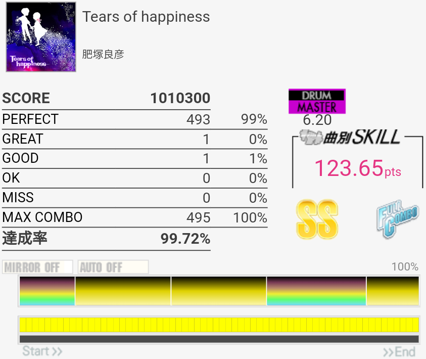 タイトルじゃわかんなかったけどこの曲か!中盤のタムとかうまく捌けたので初見エクセいけるか!?と思ったら最後ゆっくりになるところで見事に引っかかった。そんなあ。