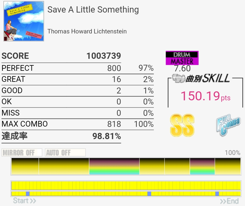 今週は日曜・火曜とゲーセンに行って動画撮ったりしてたけどあんまり成果なかった。ツーバスが全然踏めなくて困る……ただ動画見てて左手の角度がなんか変なのでいろいろ試してたら、タムを叩くときにちょっと上げ気味にするのを意識すると叩きやすくなった。クロスしかできないから左腕がどんどん下がってたんだろうな。まだすぐに戻っちゃうので忘れないようにしたい。