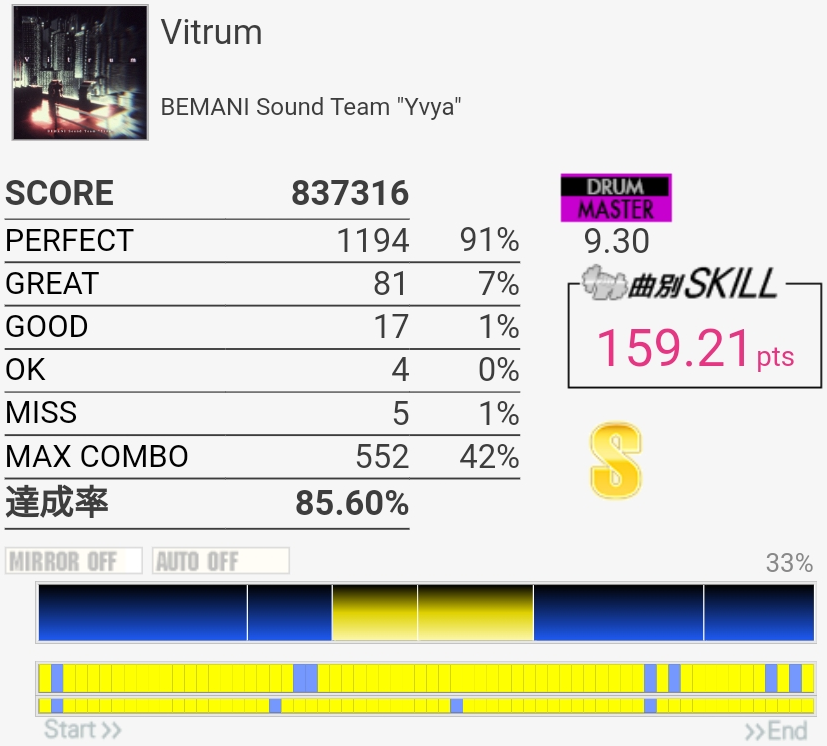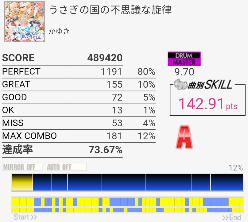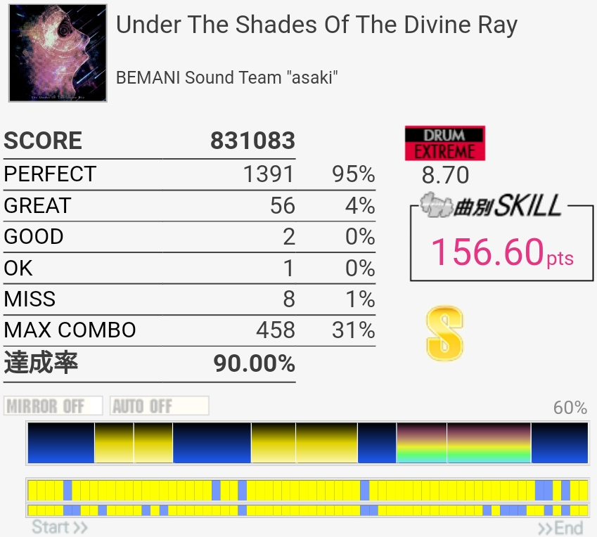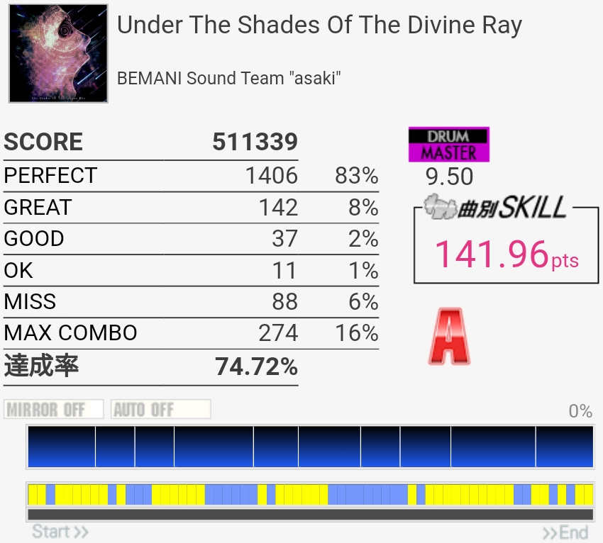 この人の高難易度譜面って交互で叩ける部分多いけど振り回されるし速いからそんな良心的とも言えないんだよな。全体的に窮屈、というのは9台後半狙って作ったらしいからそうなるか。あと変拍子にする必要ある?って思っちゃったので個人的にできるようになりたいとは思わない曲。もっとうまくなったら違うのかな~。