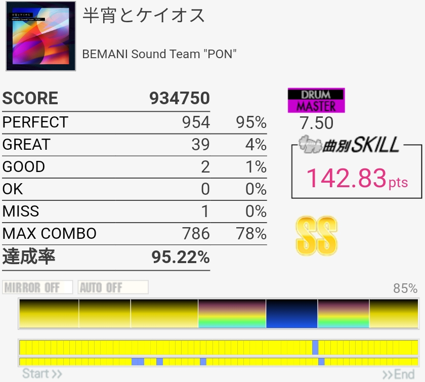 フルコン!やっとだよ。今日は真ん中のCYとHHの2連打をしっかり叩けたんだけど疲れてるのが逆に良かったのかも。緊張して最後の足がめっちゃズレた……。