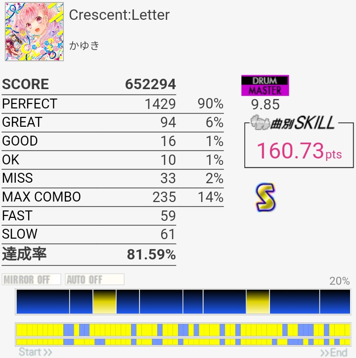 あと溝の口ロケテの時点でFor UltraPlayersのMAS-D譜面が変わってるっぽい?コナステ版でスカスカだったところにノーツが増えてたり謎のLPズレが直ったりしてるし、クソみたいなゴリ押しが消えて新しくゴリ押しが増えてる。まあどう考えてもコナステ版はおかしかったけど新しい方も別にやりたい譜面ではないな……他機種のボス曲だからって無理に難しくする必要ないじゃん。
