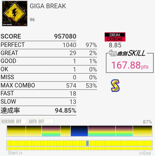 序盤のCY刻みでリズムを間違えて2個。32分入りのSNとかめっちゃうまかったんだけどなあ。