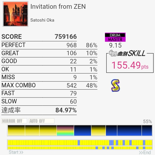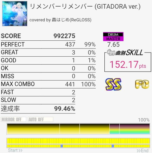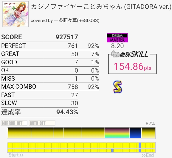FTの位置がなんか掴めなくて5フレーズ目叩けなかった。4フレーズ目は普通に叩き間違えたのでいいんだけど、6フレーズ目の変速SNのところは手順覚えないとダメだな~。