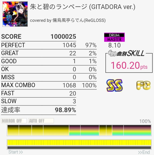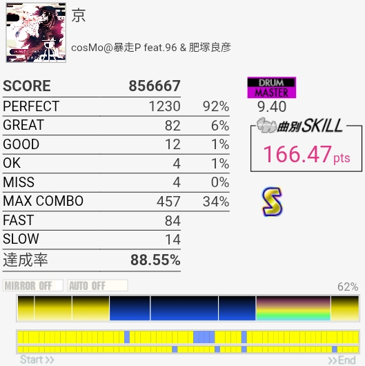 HH刻みが遅れると4分BPも遅れる……って感じでかなり崩れやすい。というかこの速さだとペダルの感触がないと厳しすぎる。サビのハネHHが特にヤバくてここでパフェ率がガタ落ちするのでSS取れなかった。全体的にちょっと判定おかしくない?って思っちゃうくらい。あと最後の16分SN速すぎ。