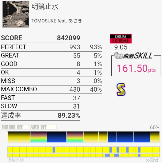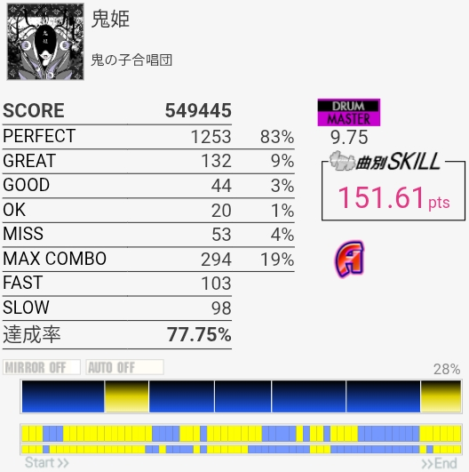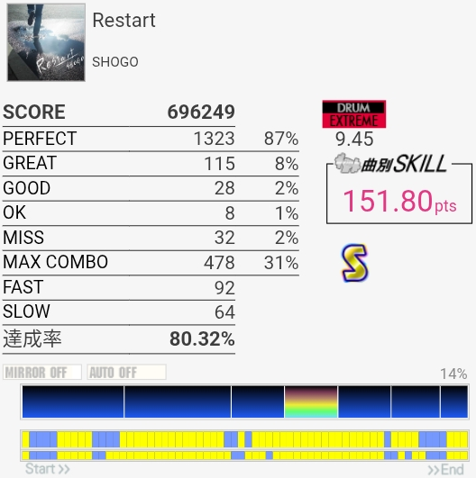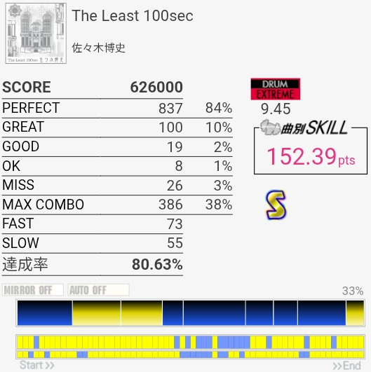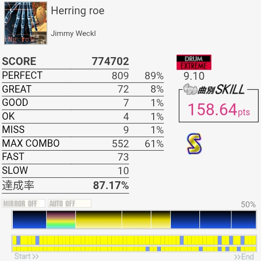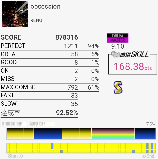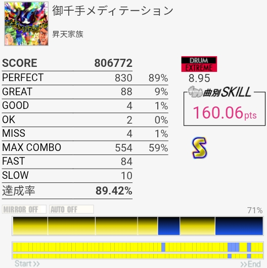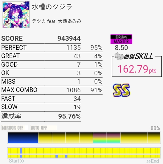パフェ率終わりすぎ!たぶん前半の左手でHHを叩くところが全部GOODだった。