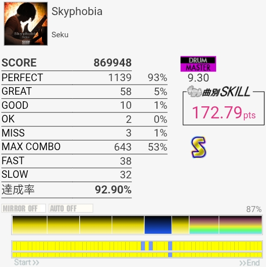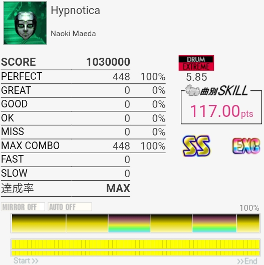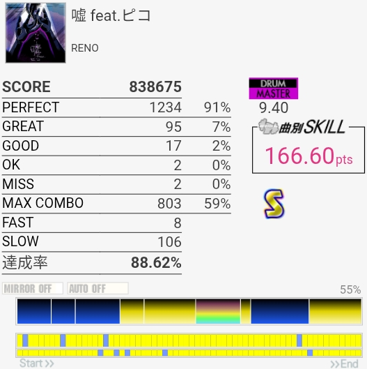 これ繋がるな!4フレーズ目のシンバルが苦手だったんだけど今日はなんか叩けた。ラクリマ粘着したせいで判定の感覚が狂ってたけど……RENO曲の譜面は相互互換的な感じあるな。