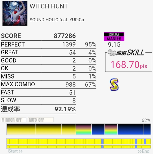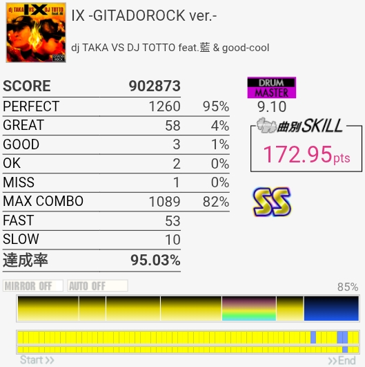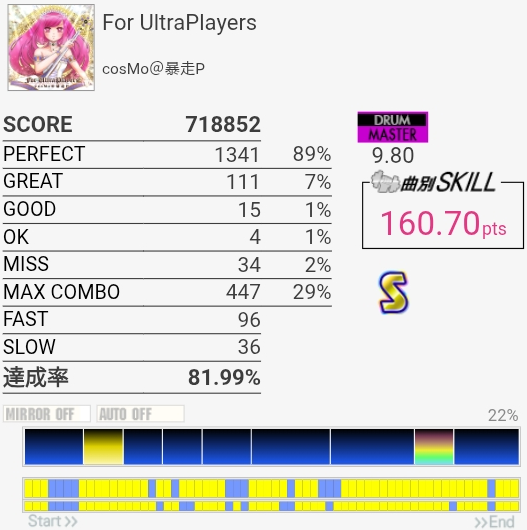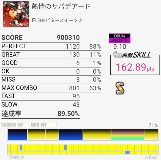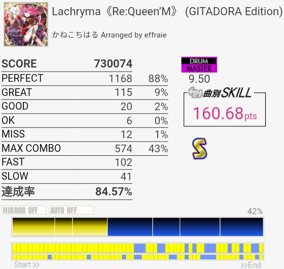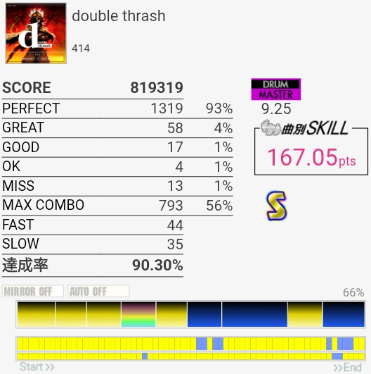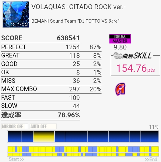 最初と最後をバッチリ叩けたのにサビでHHを打ち損じちゃってすごくもったいなかった。サビのツーバス地帯も何気にミスしやすいんだよなあ。