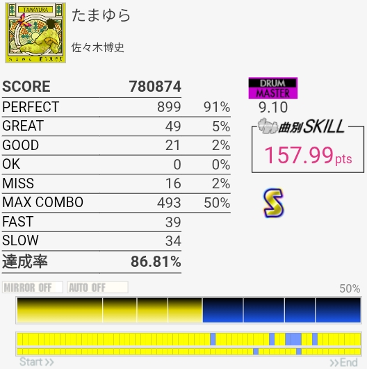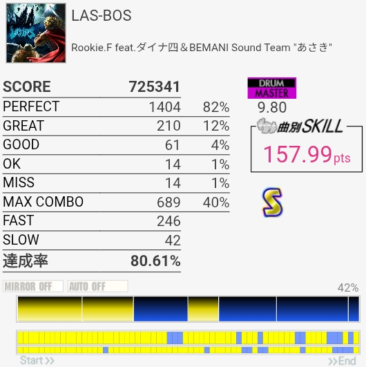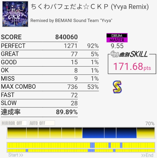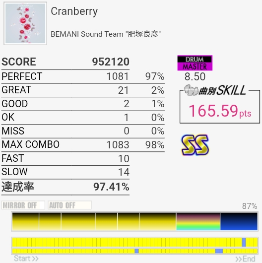 SS取得。タムとシンバルが絡む部分激ムズすぎる……タムからのLC+SN連打が二度と繋がらなさそうなのでここで決めたかったな。
