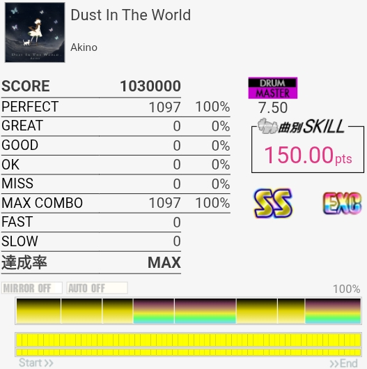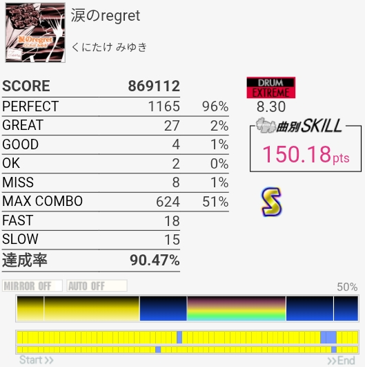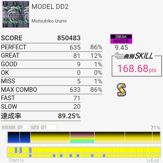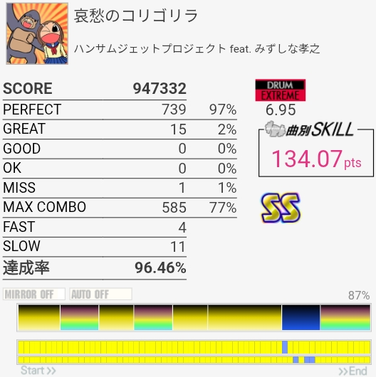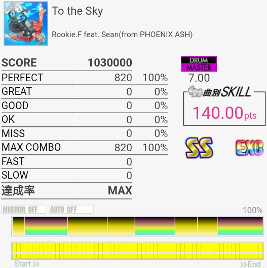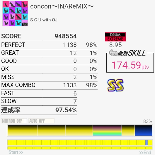 以前はデデッデデッデデッデデッのところの左右振りがめっちゃ苦手だったんだけどさすがにできるようになってた。サビ終盤でグレ量産してしまった……。