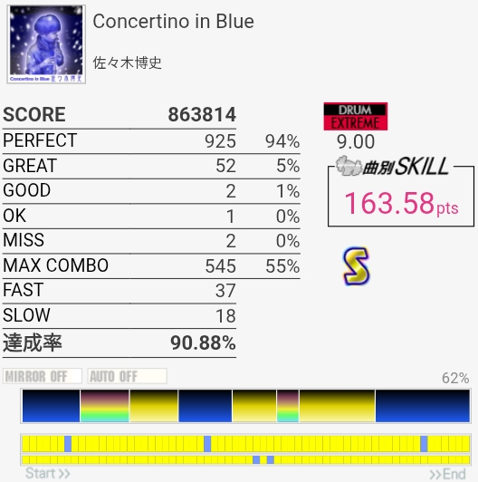 譜面かなり忘れてたわりにはけっこうコンボ繋がった。3フレーズ目はスティックが引っかかっちゃったので覚えてれば叩けそうだけどラストはちょっとキツいな。