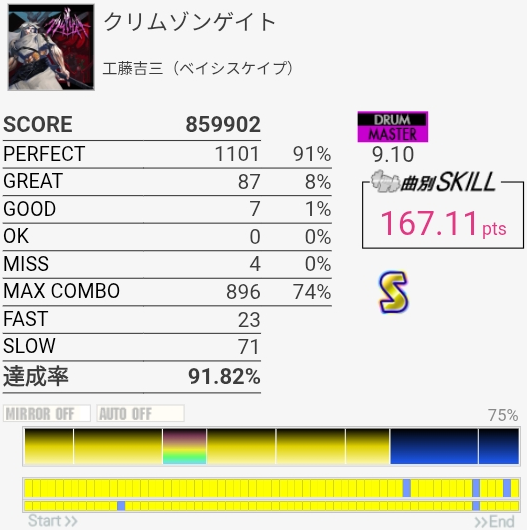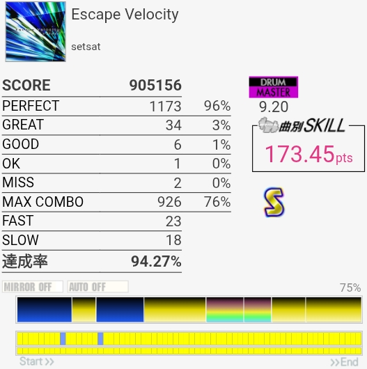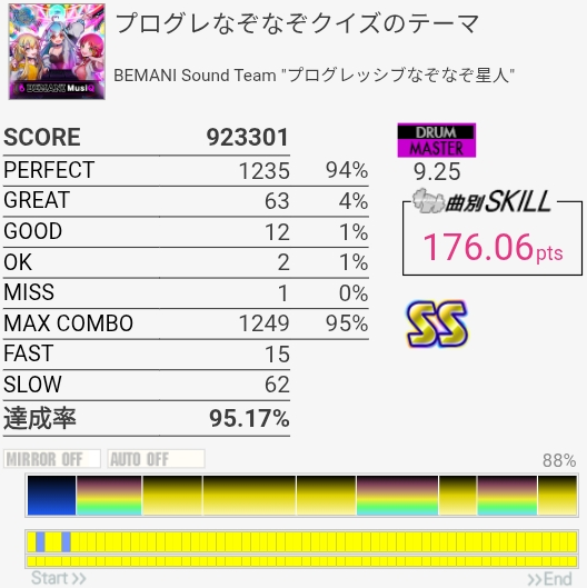 SNで謎のミスが出て萎えてしまった。どっちにしろフレーズ終わりで切ってたんだけど……そしてラスト全部GREAT以下だった。後ろにあるポラリスコードの上画面が反射するせいで定期的にシャッター付け外しみたいになるんだよな。