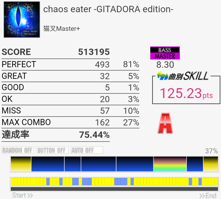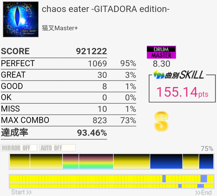7.80くらいの譜面なんだけどそれなりに速いので偶数タムが叩けない。ほんとに金ネームか?冷静にやれば叩けるはずなんだ……ラストはBPだけ見てればギリ繋がりそう。