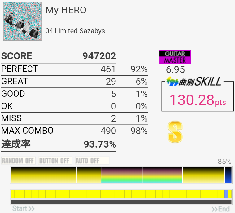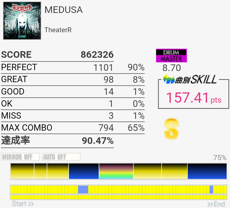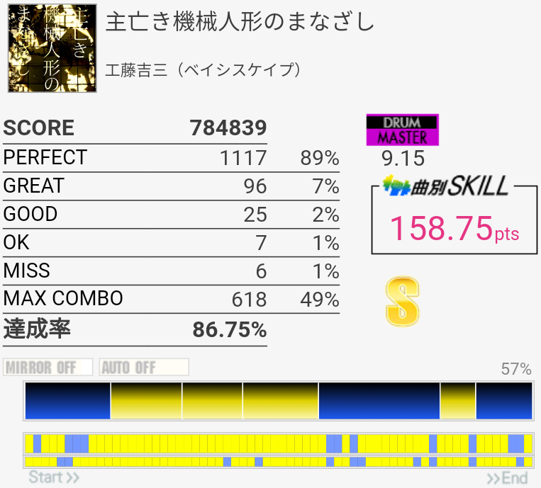 4フレーズ目が全然繋がらなくなってしまった。というかLT→FTの片手が精度低い。パフェ率が低いのはラストのツーバスでズレたからです。