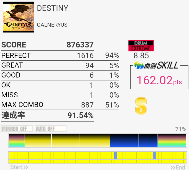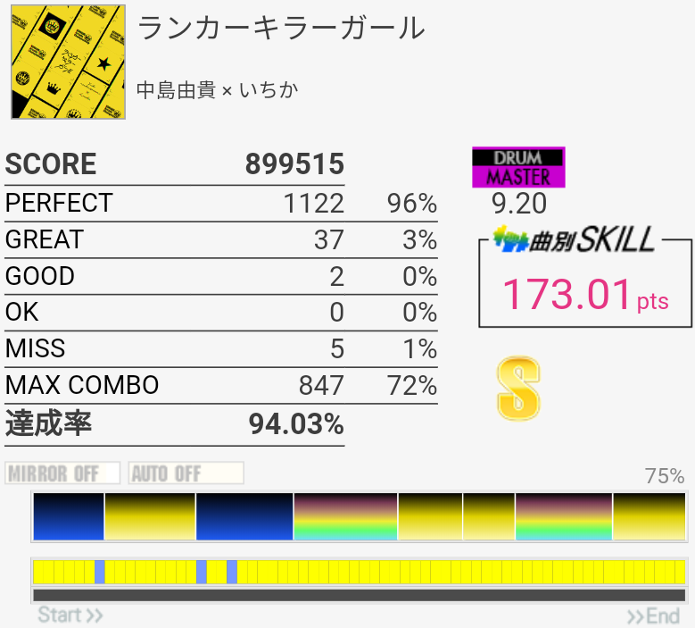 初見で170点取れる譜面……と思ったら初見が一番上手かった。Aメロ2のタム回し→FT×2→SN+CYだったかが一番の切りどころかな?個人的にはラストに癖がついて右手がどっかいっちゃうようになってしまったり16分SN連打→FTがわりと追いつかなかったりする。2-2-2-2は思ったより叩ける感じでよかった。