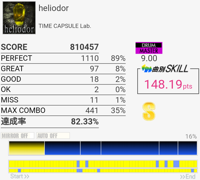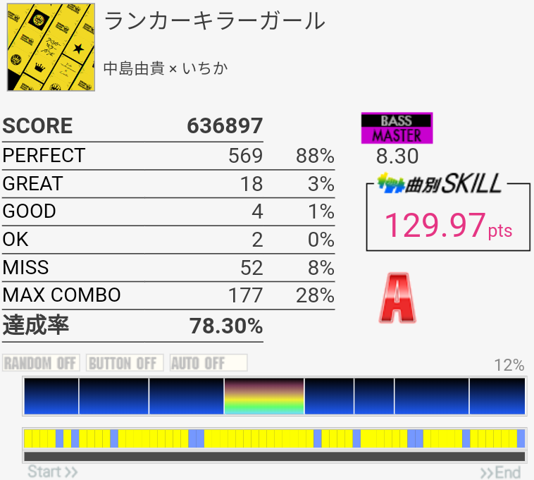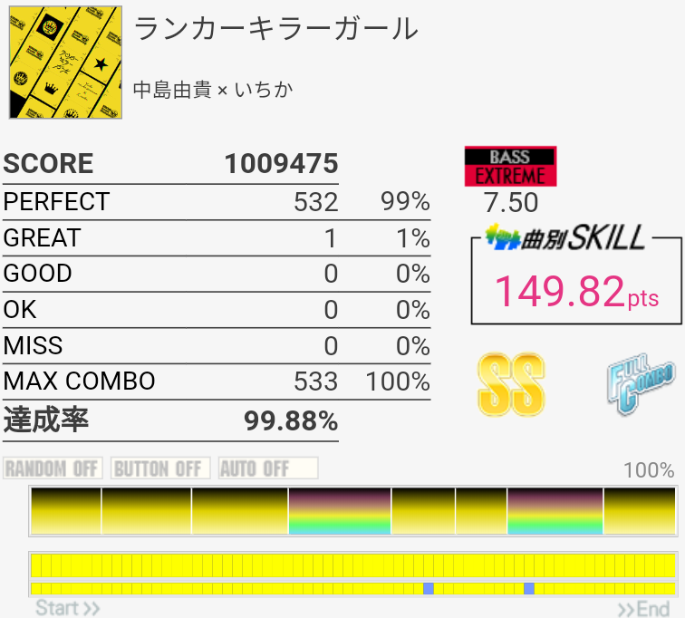 コンボ的には今までで一番だろうか。パフェ率が終わりすぎていて仮に繋がっても対象に入らない感じ……最初と最後はどうすれば安定するかなー。