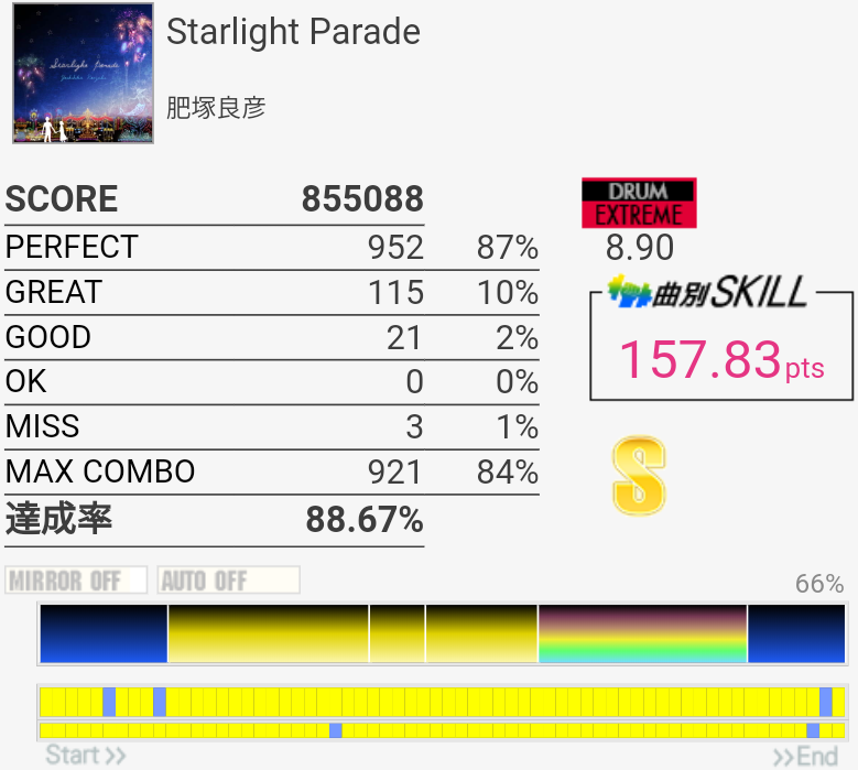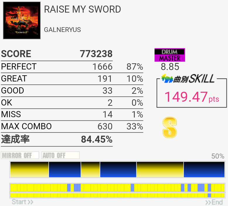 うーん前半でミスってると論外。やっぱり2フレーズ目終わりのタム×4→シンバルが苦手……。