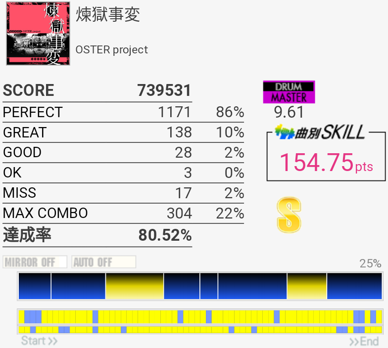パッドがやけに跳ねなかったり床と椅子が傾いている感があっていつも以上に叩けず。という言い訳をする。