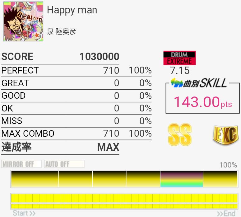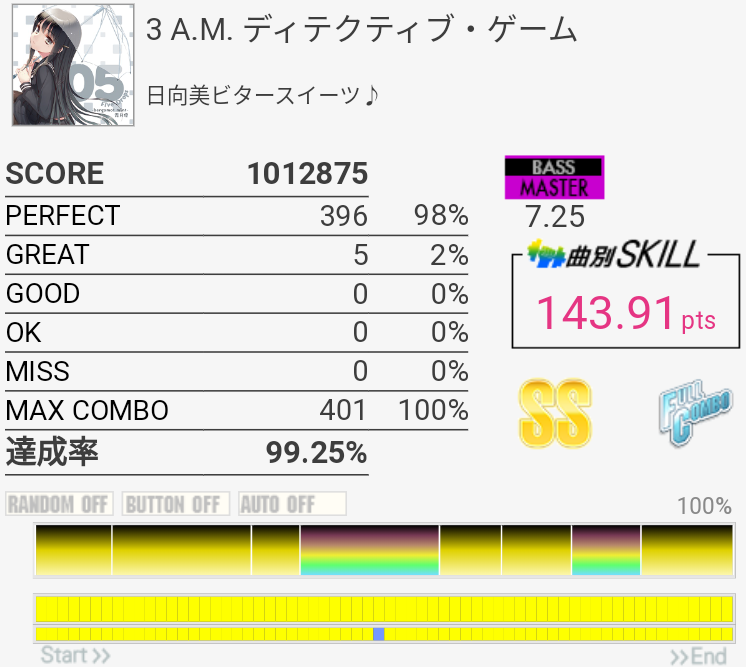 そういうわけで泉さんの曲をちょこちょこ触っていたらなんかエクセ出た。イントロの16分裏入りSNからして全く覚えていなかったし両手同時8分連打とか超苦手なのにね。たぶんすごくPERFECTが出やすいBPMなのだろうな。最上位譜面でのエクセはCutie pieに続いて二曲目!最高エクセレント難度も大幅更新。