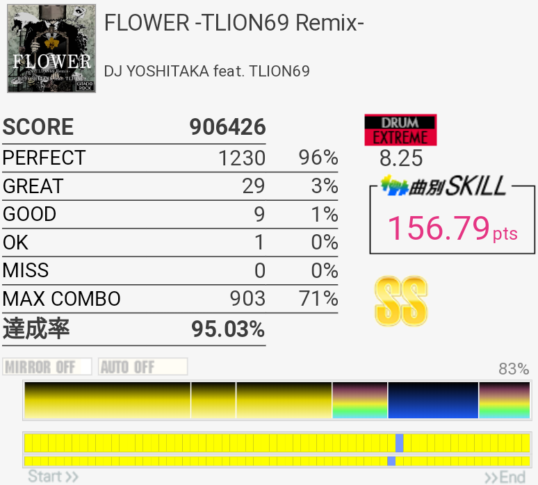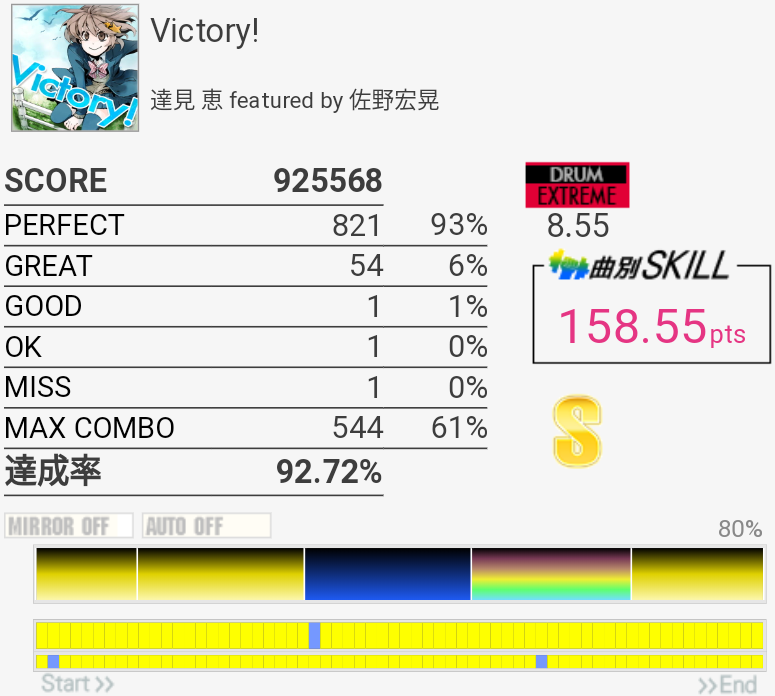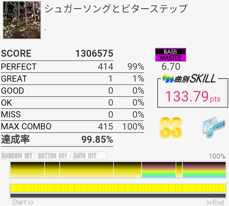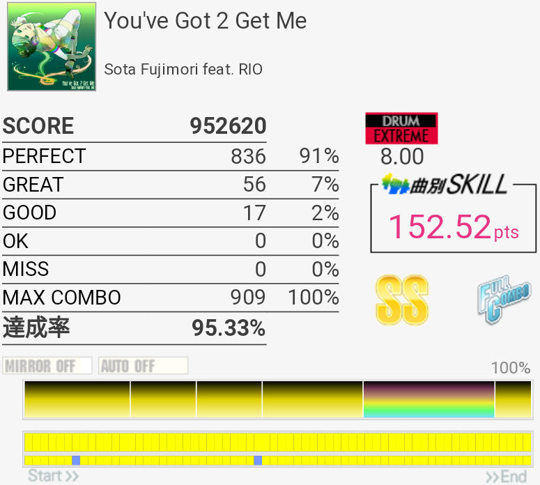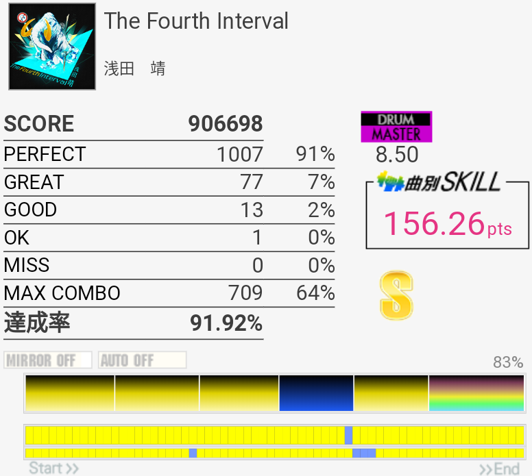 課題曲、SS取得。なぜ繋がってるときに限ってそこを切る……イントロと真ん中の「ヤッ」のシンバルFT同時に癖がついちゃってるのでもう無理。