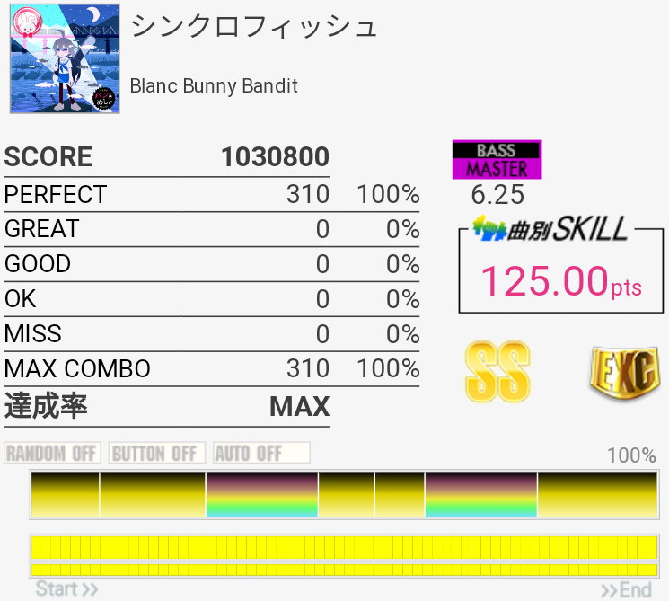 今作やってなかったのでやったら対象入り。一回目のサビでなぜか足をミスったのがもったいない……Aメロ終わりのキツいところは全部取ろうとしてミスると次のフレーズも取れないので、いっそ捨てた方が伸びて170点取れるかもしれない。