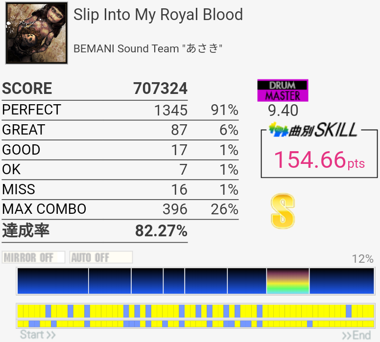 まあ万全の状態を作れなかったのが悪いということで。普段もっと上手いんだけどな。ちょっと調子悪かったな。仕方ないね。っていう言い訳を今年は減らしたいですね。・Slip Into My Royal Blood (MAS) ようやくプレアン更新。今月は水曜日5回あるけどもう一回更新くるのだろうか?それともプレアン更新が第一水曜日に変更になったのか。えっと譜面はいつものあさきです。ツーバスが踏めればSは出るけど。