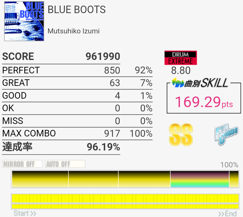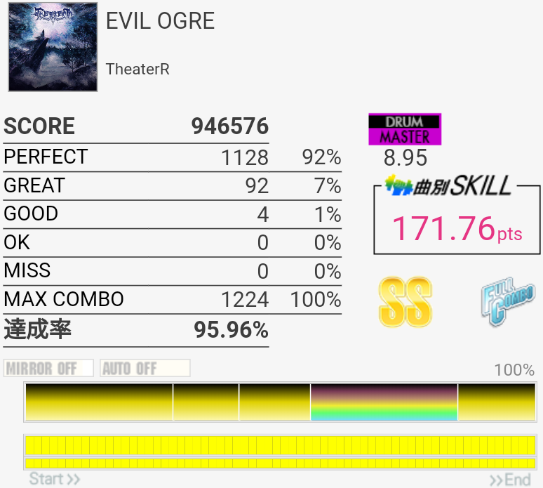 オープンで叩くの自体はけっこうできてたけどLT→SN→SNのSNが抜けるかHHが崩れるかしちゃう感じだった。しかし何回やっても意味わからん譜面だな……。