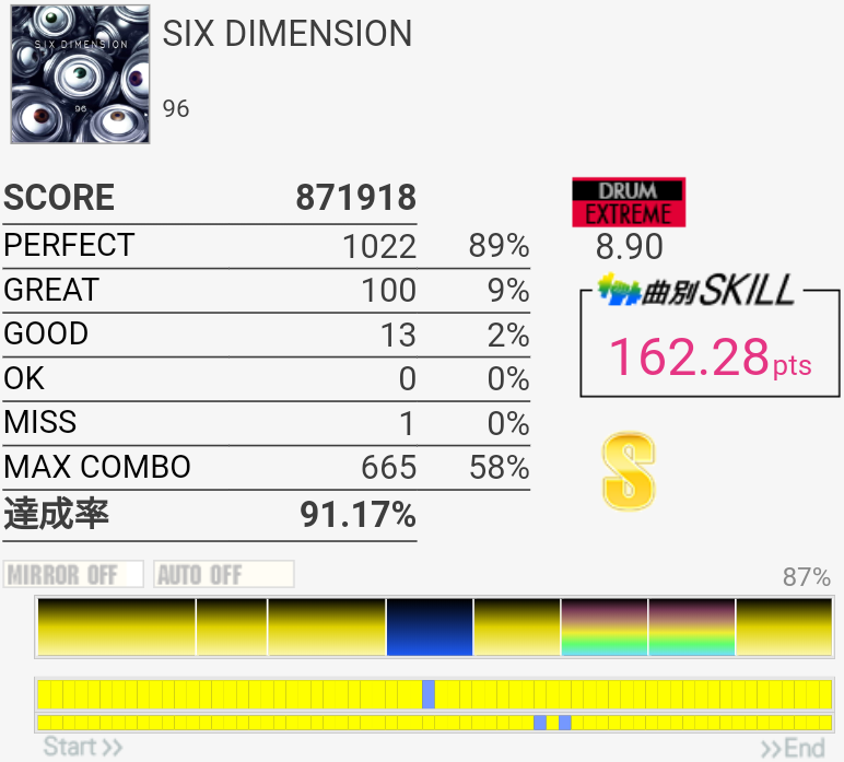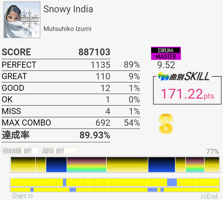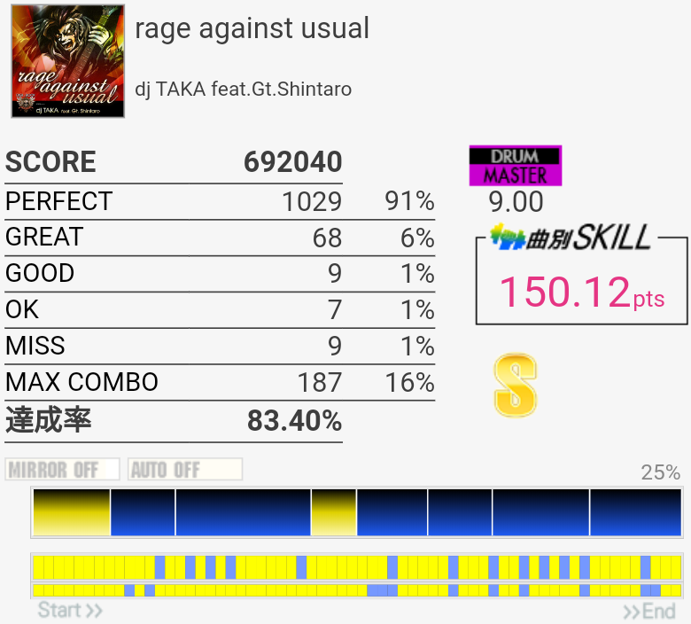 お前急に入ってきたな!?170点8曲目。タム部分の1パターン目はHT→LT→FTをLRLで取ってて、それでギリギリ次も叩けてたのでまあそれでいいのだと思う。3パターン目で崩れちゃって出口の16分も叩けん。なんとなくやるかーって感じで選曲したので170点取れててびっくりした……最近IIDXをがんばってるおかげで譜面認識力が上がっているのかもしれない。3フレーズ目終わりのFT×3だったかを反応させられなかったのがもったいないなー。