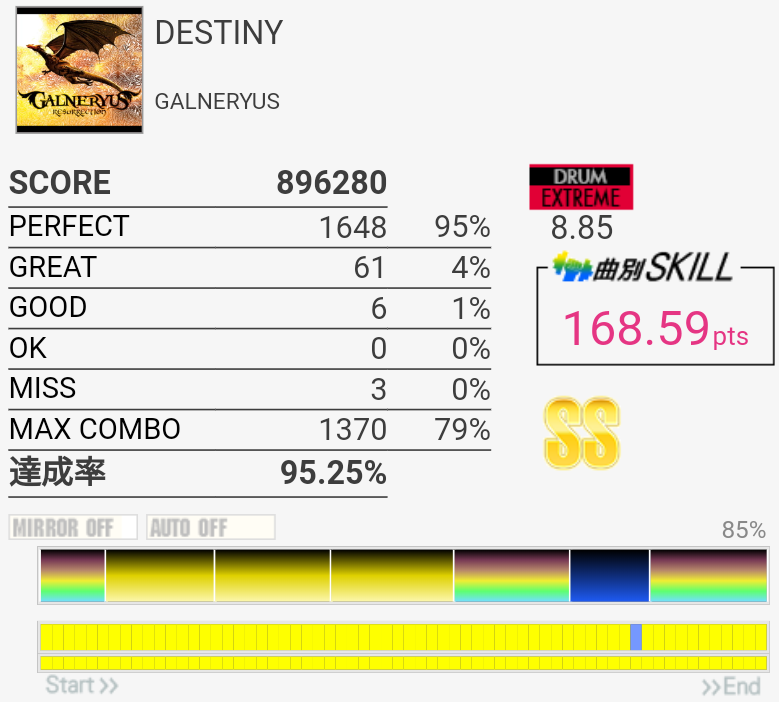 繋ぎ直しで170点7曲目。パフェ率がひっくい……後半のツーバスとCYSN交互が全然ハマらなかった。