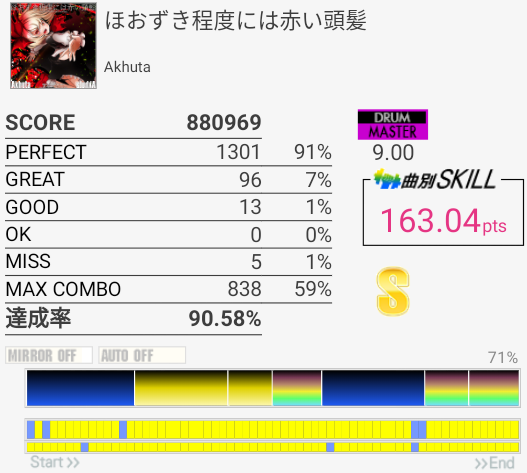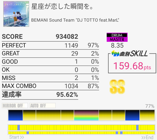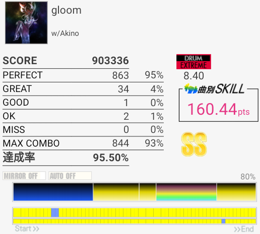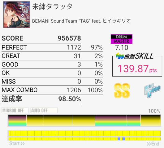 SS取得。譜面全然覚えてなかったけれど逆によかったかも……。8フレーズ目の16分SN→HH×2は表裏どっちかいまだにわかってない。