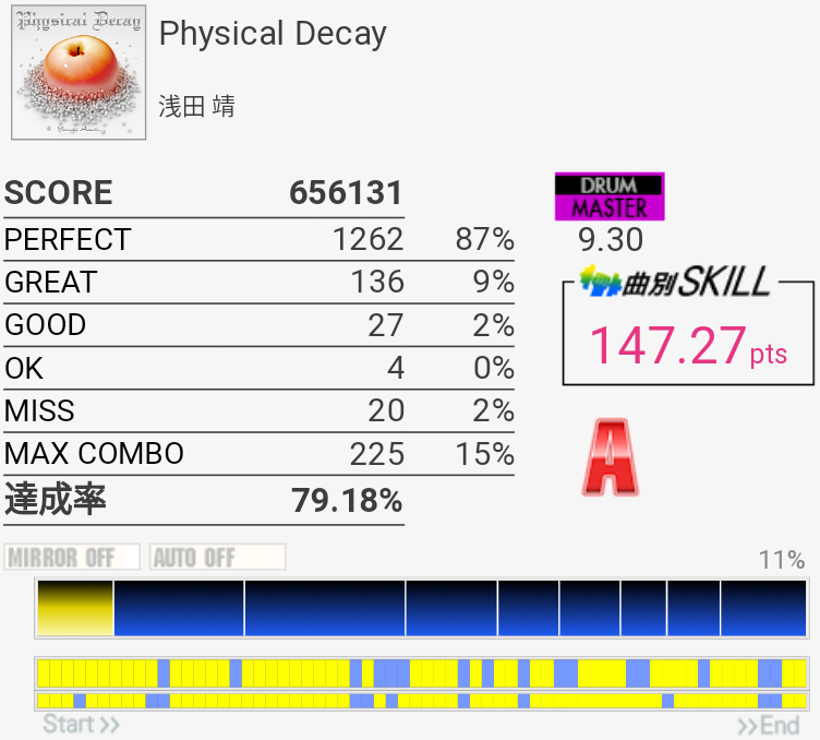 譜面を再確認してブレイクのところはちゃんと叩けた。けどどうでもいいところでミスりすぎる。あとは回数!