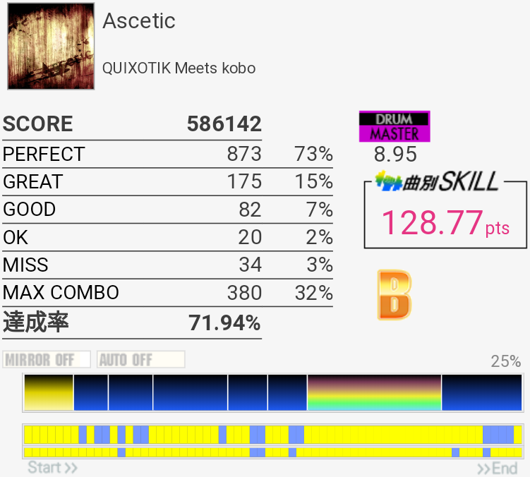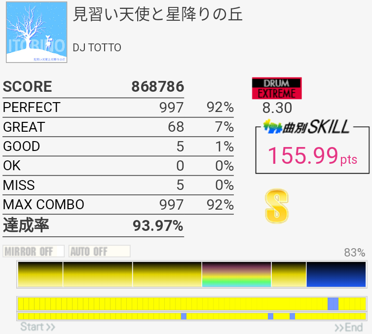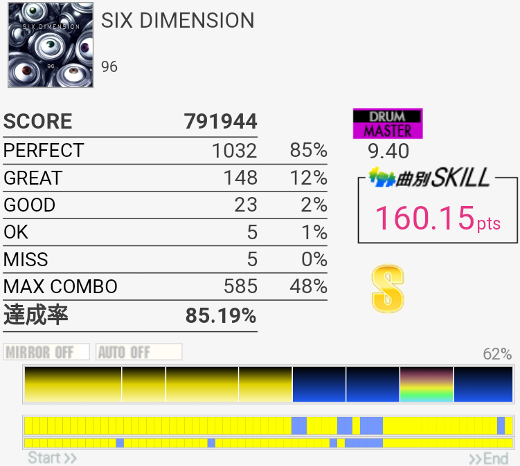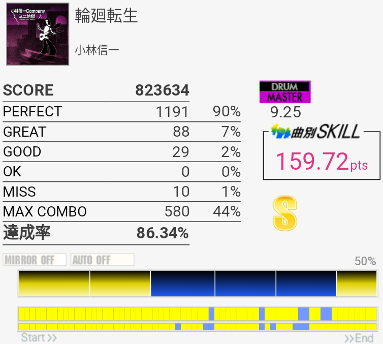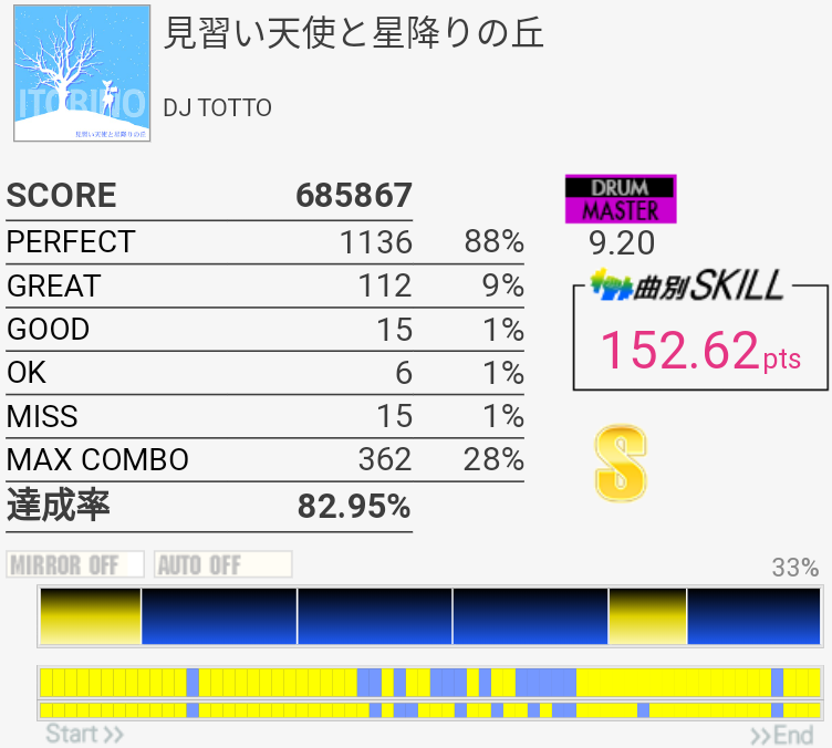 課題曲。これ上位陣は当然繋いでくるよなあ。LP入るSN×3のところで力を入れないと叩けなくて相当スタミナを持っていかれるのでそのへん改善したいな。