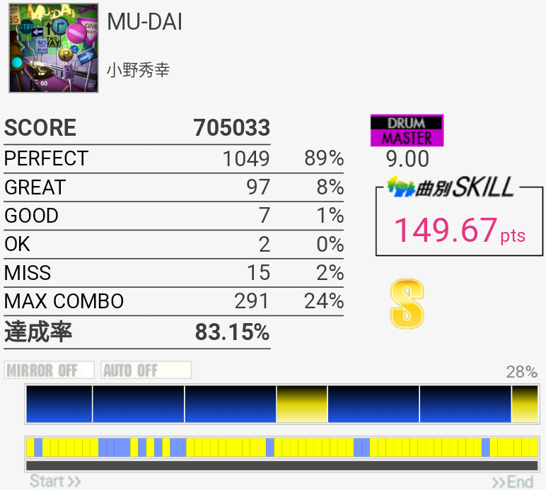 ラストが強烈……配置的にそこまで鬼畜ってわけでもなさそうだけれど、このゲームのシステムだとあんまり好ましくはない譜面だよね。5フレーズ目のLP踏みながらの左入り連発も結構キツい。LT→FTの表裏もわかんなかった。