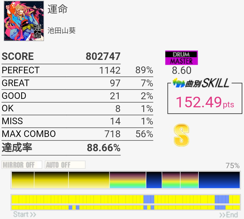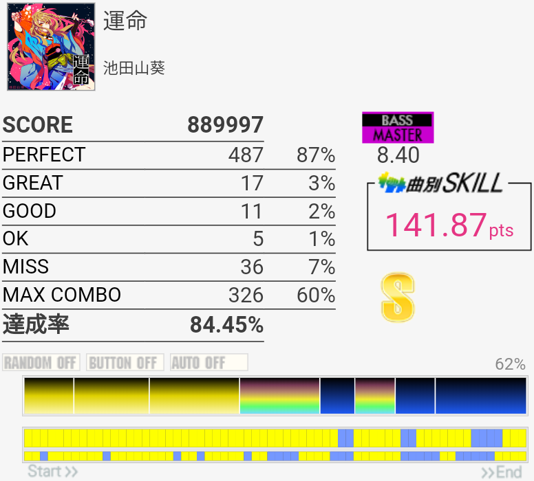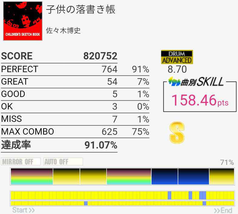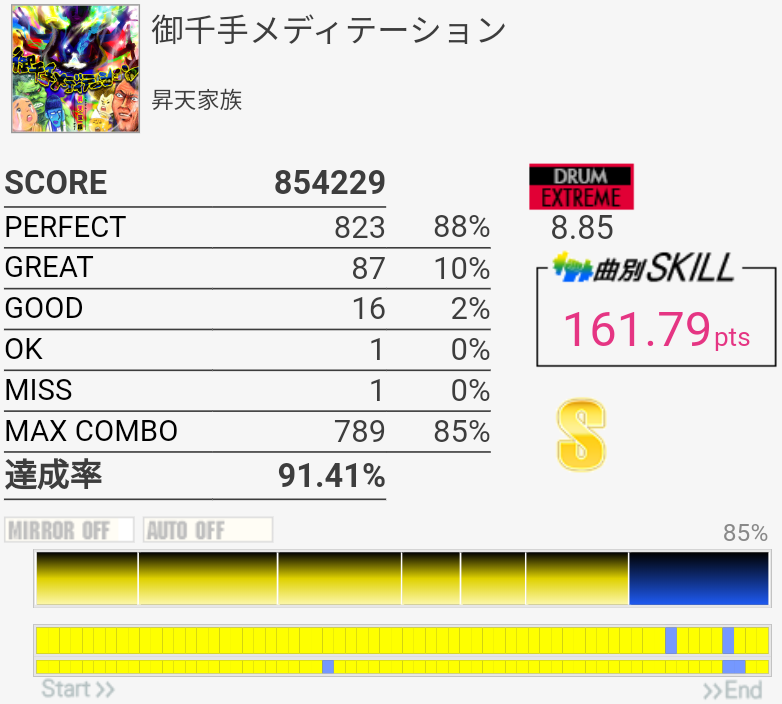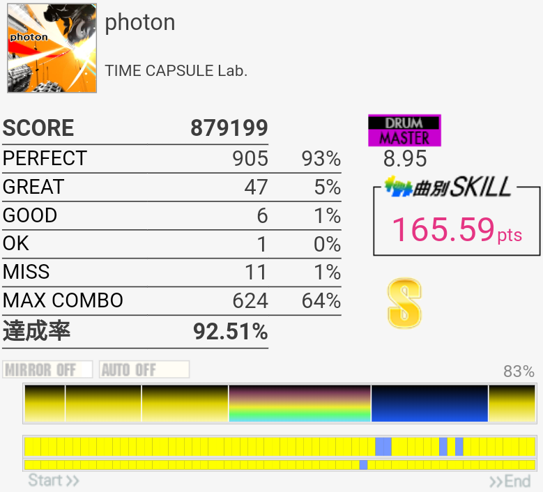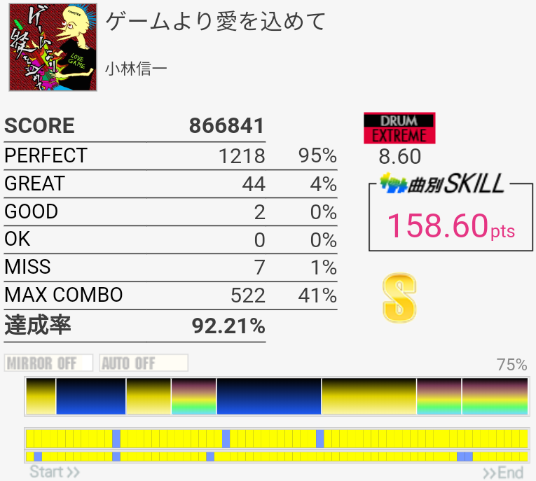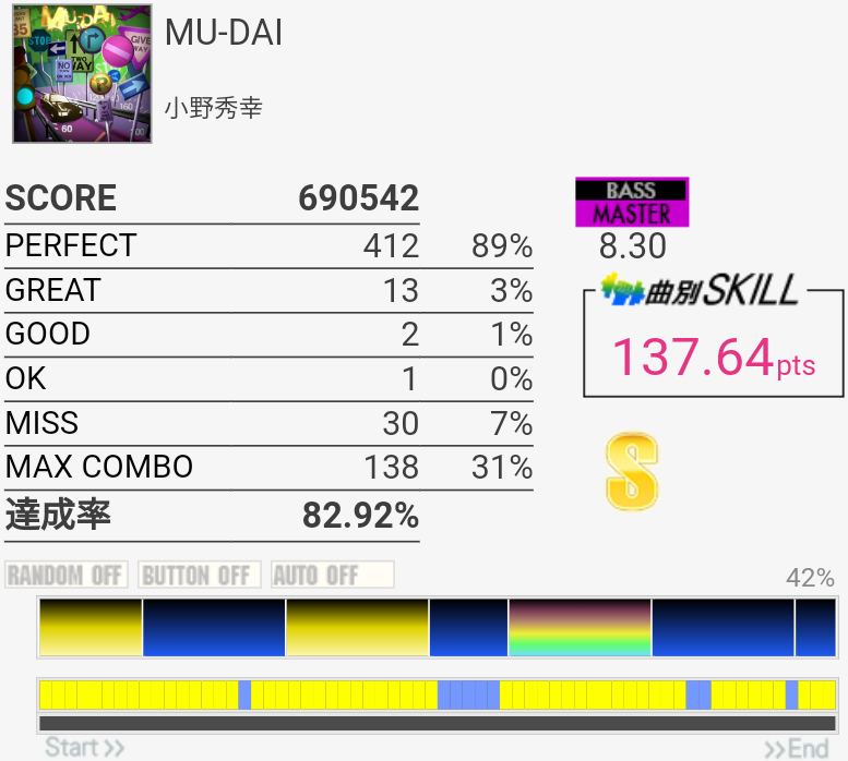 EXTはラストの4個部分でGREATが出てしまった……MASは複色部分は比較的流れでスライドできる感じなのであんまり苦にならない。16分の運指は無理。