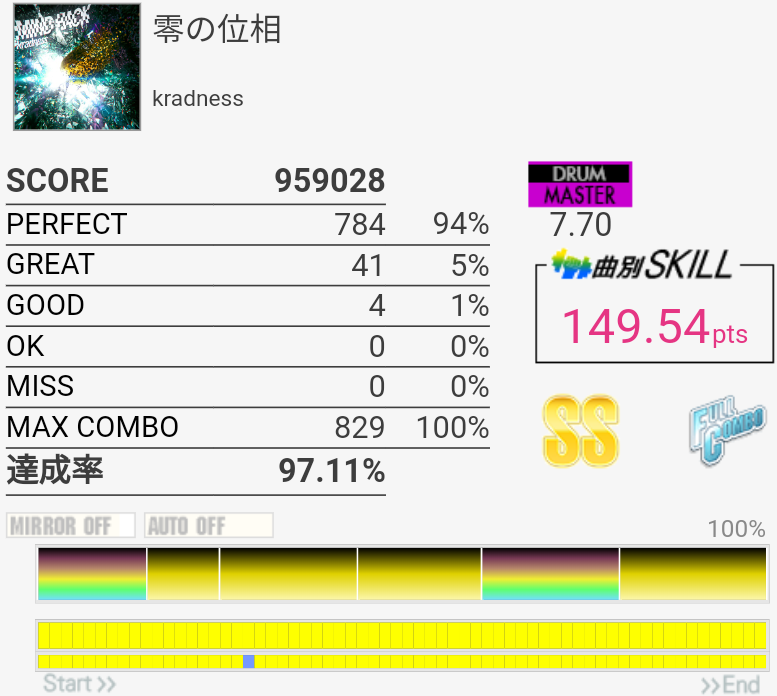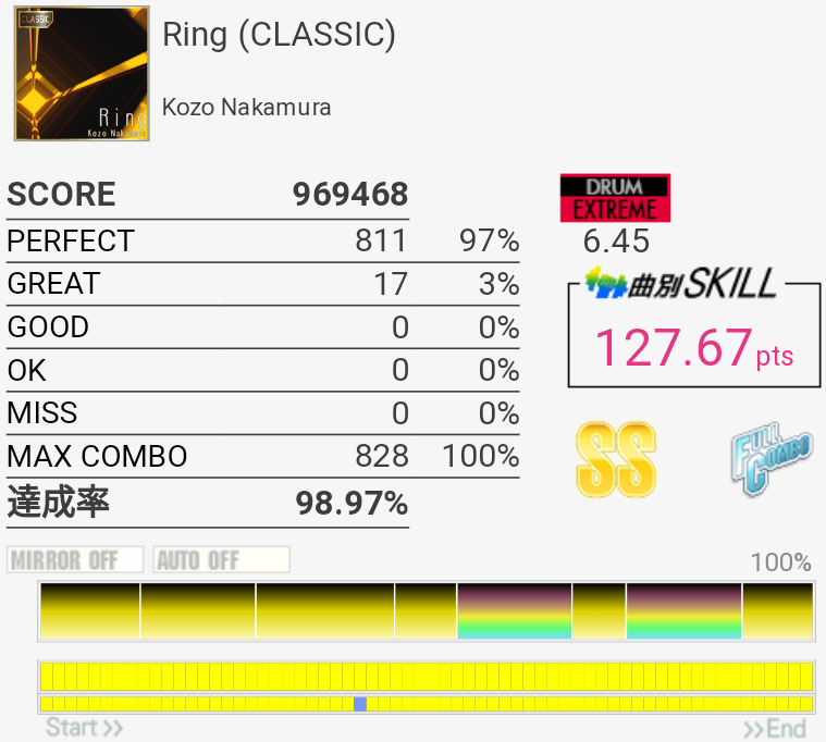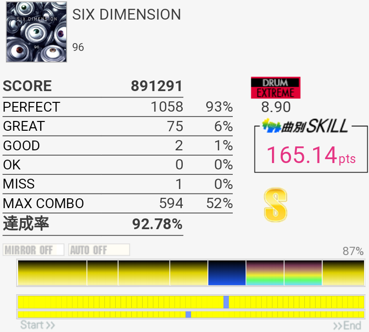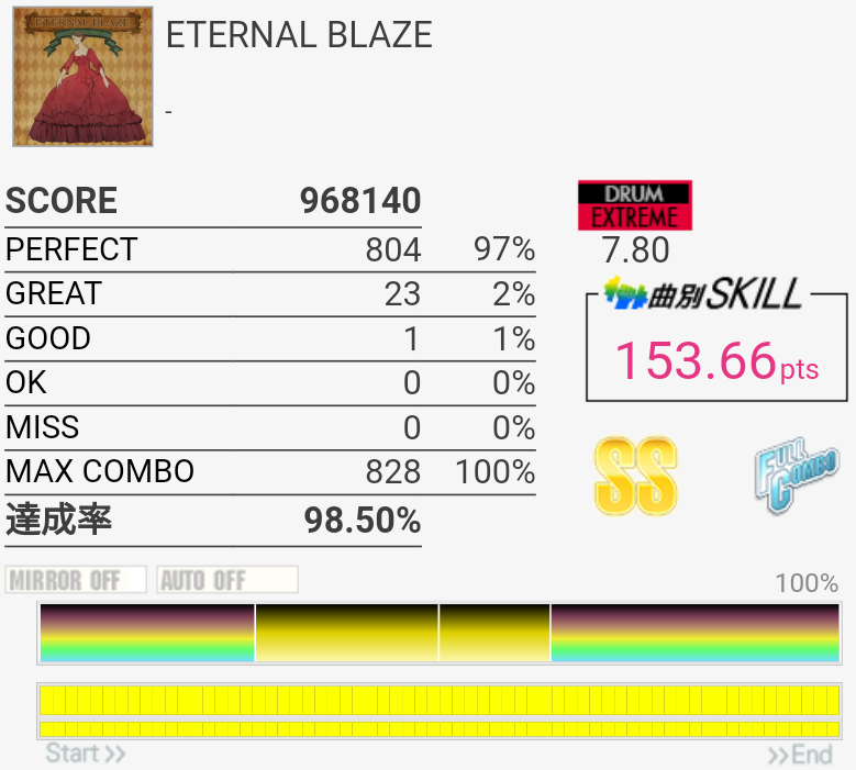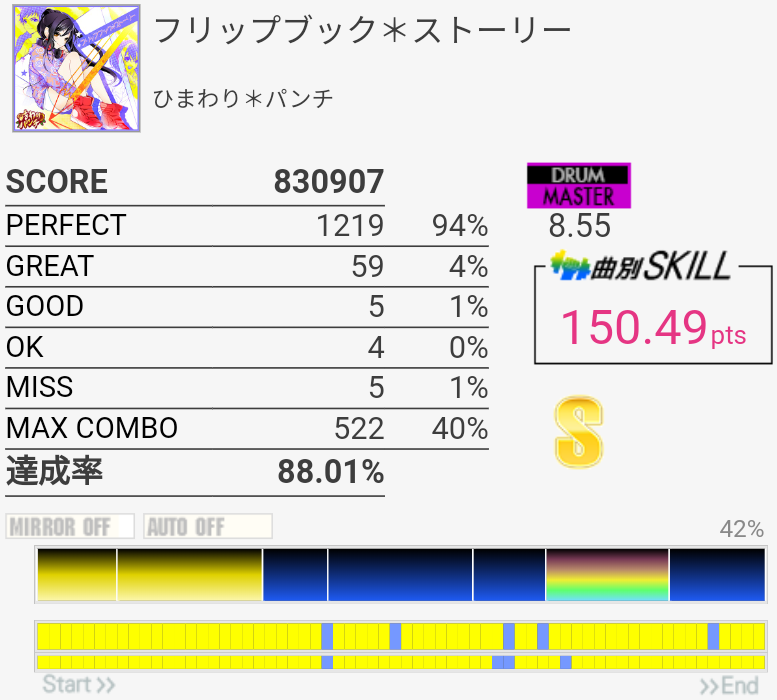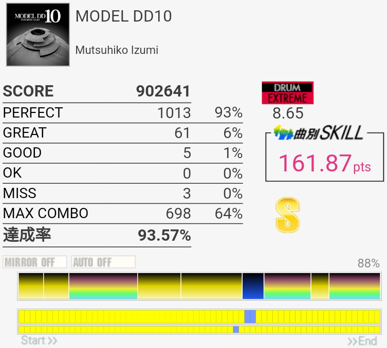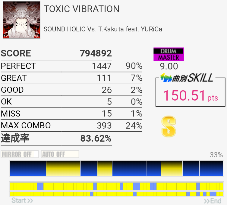 HH×2の二打目が抜けた。ちゃんと叩いたと思うんだけどなー。SNもタムも頻繁にアレって思う時があるし、いまいちホームの筐体が信用できないけど自分もちゃんと芯を捉えられていないのでなんとも言えない。