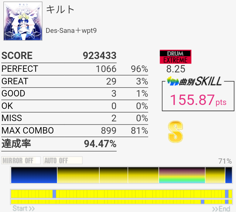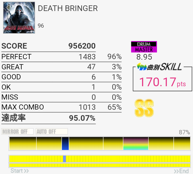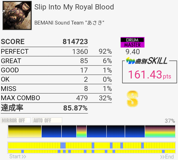 170点9曲目。3フレーズ目のdkdkはSNが8分裏なせいなのかよくズレてしまう……パフェ率が比較的よさげだったのでもったいなかったな。2-2-2-2は完璧に叩けた。