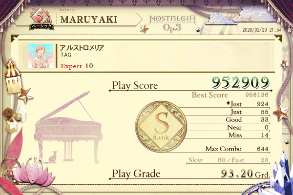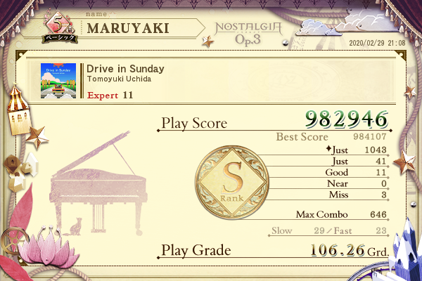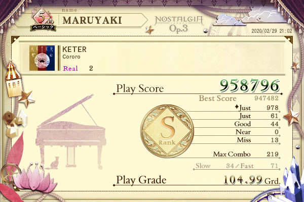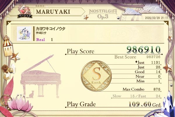 Op.2から本格的にやり始めてベーシック3級でした(ピアノ弾きできないので2級に受からない)。Op.3からはリサイタル演奏が自由に選べるようになったのでそっちでやってます。ベーシックGradeも保存されるしあえてベーシック演奏でやる意味ってないよね?最近はベーシックGradeが5500突破してひとまず上げなくてよくなったのでLv9、10あたりでピアノ弾きの練習をしつつリサイタル5級受験が目標。