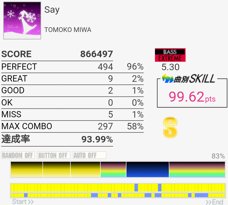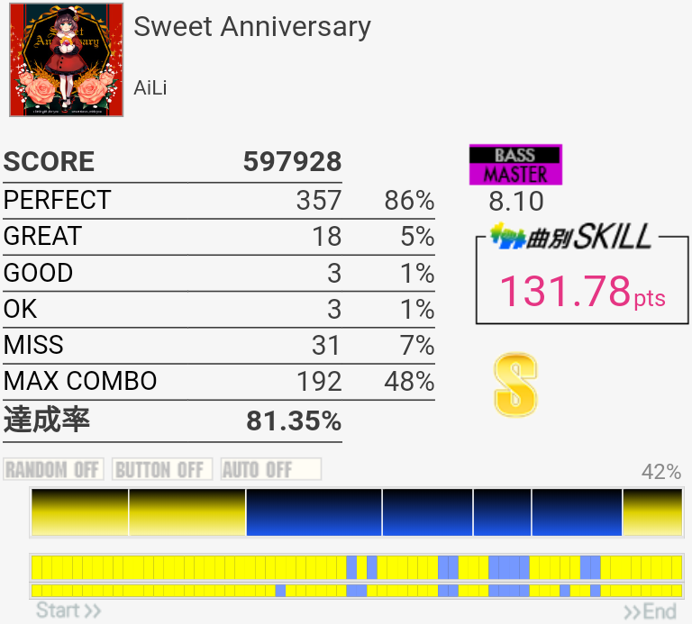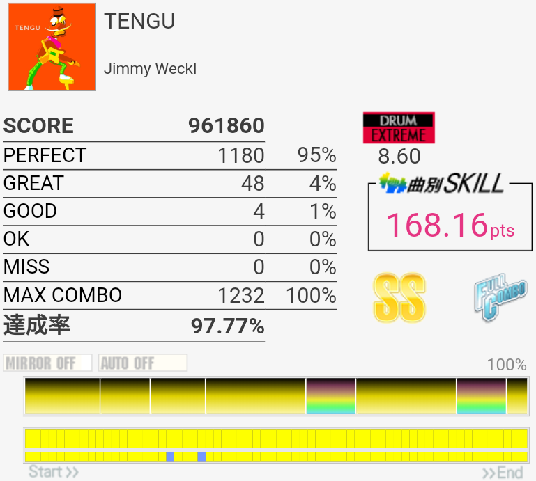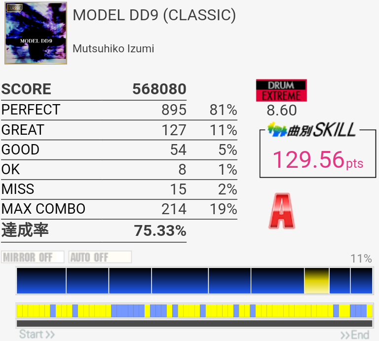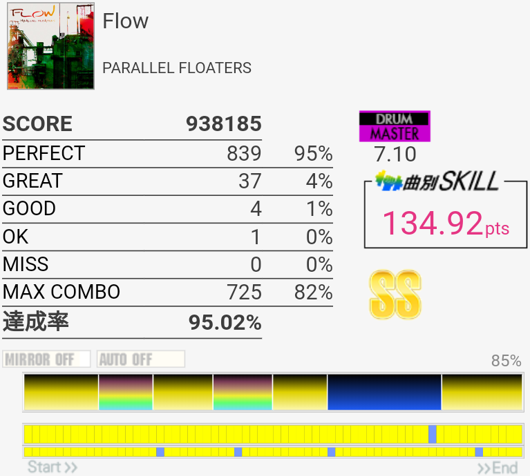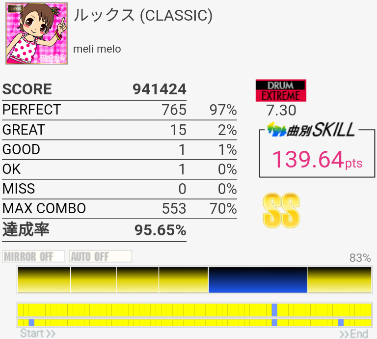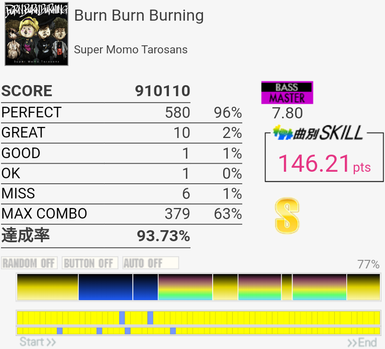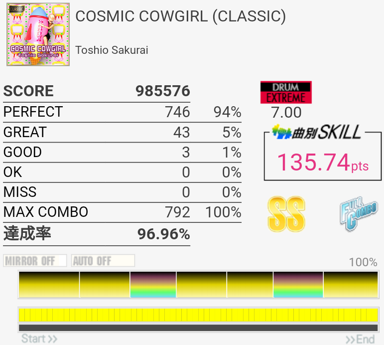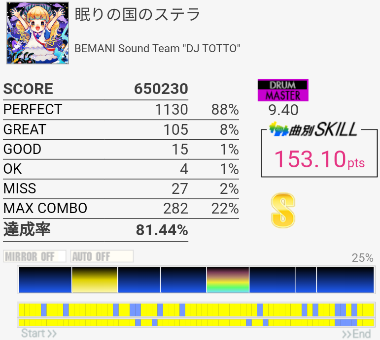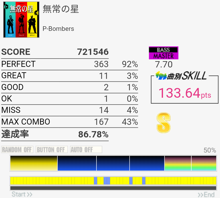疲れて朦朧としている中なんかこの曲をやっているときだけ譜面が若干スローに見えて体もよく動いた。そういうのはもっと難しい曲の時に来てくれ。
