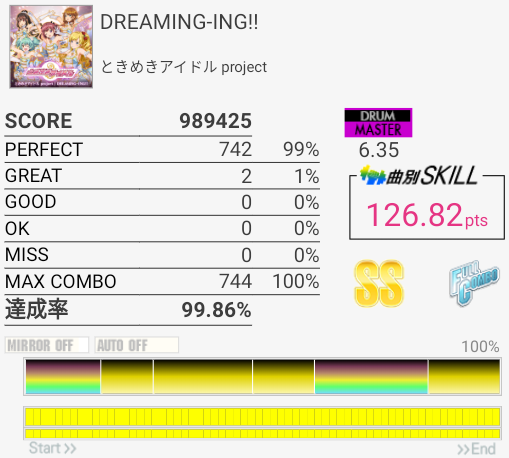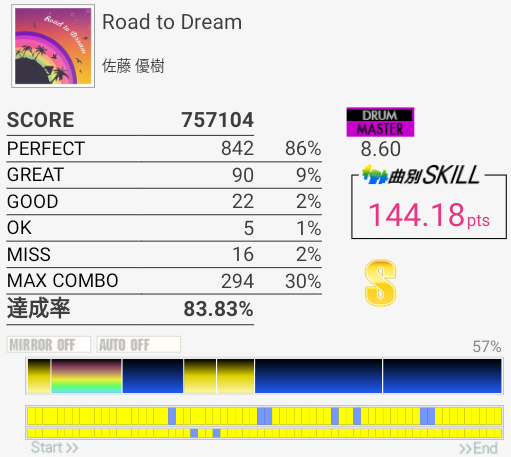 全然やってないぶんちょい伸び。4フレーズ目のクソ速SN×3地帯以外は叩けるらしい。刻みでミスっちゃうのはダサい。