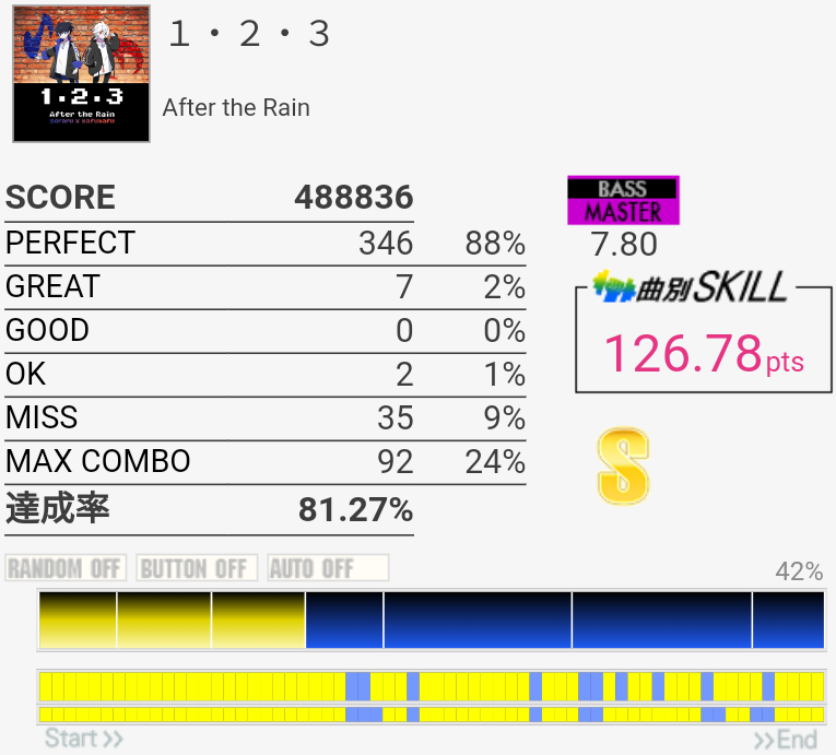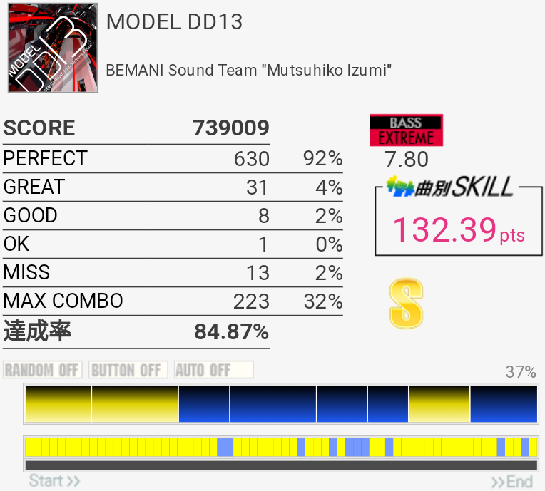 何気にNEXTADIUM課題曲なのでADVは今日繋げられてよかった。ギタフリやってる人がいて曲は全く聴こえなかったので遅くなるところだけ気を付けた。EXT以上は細かい連打が多くて無理。
