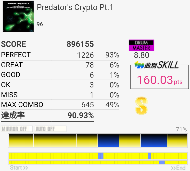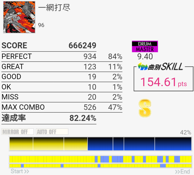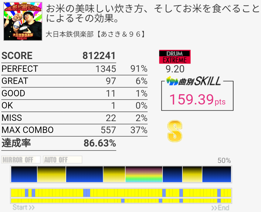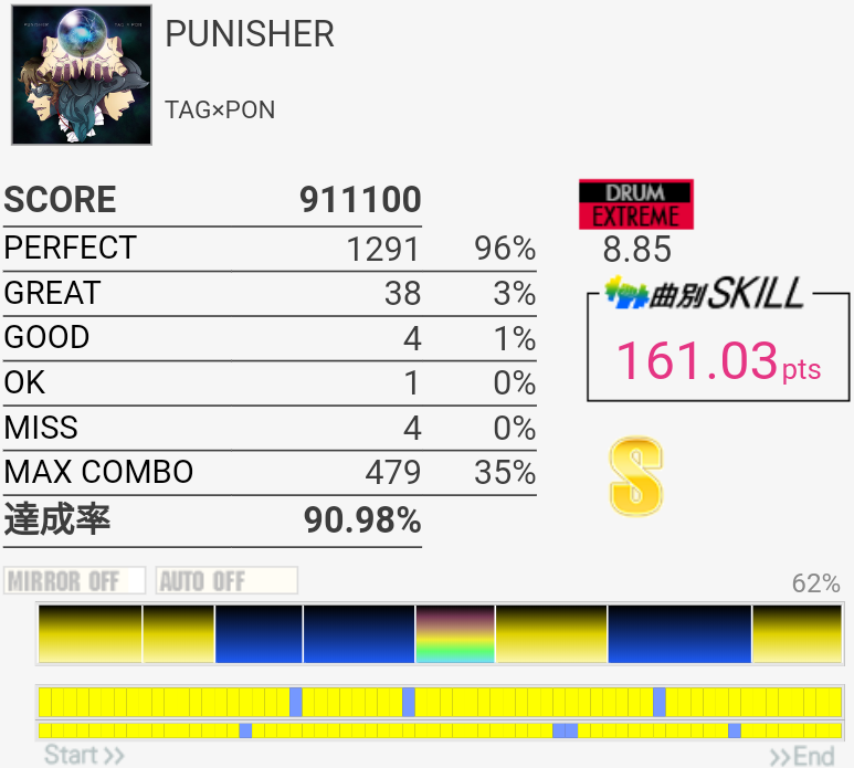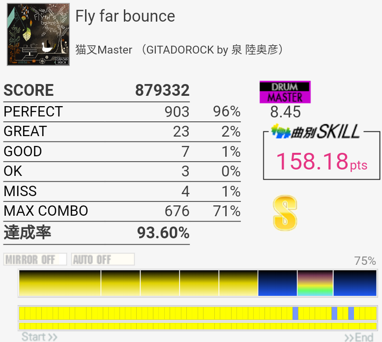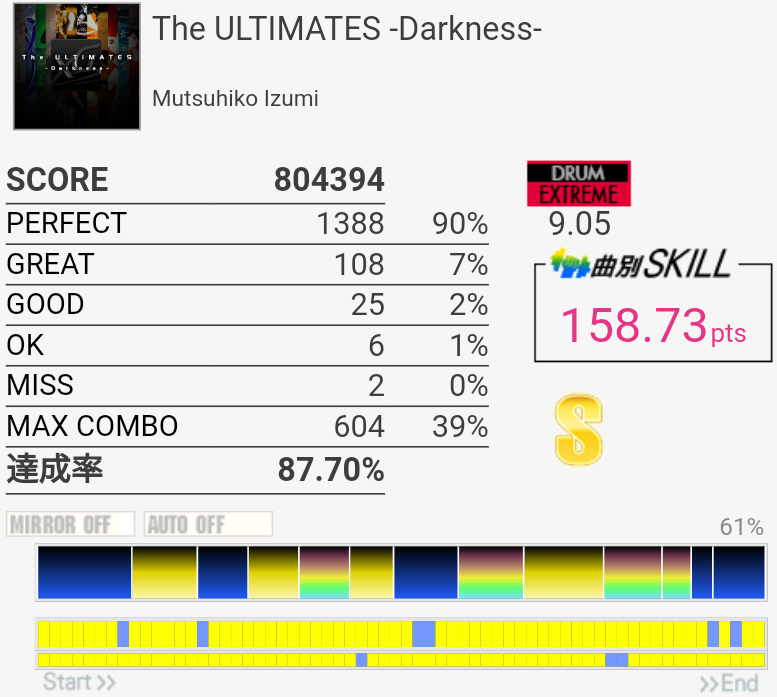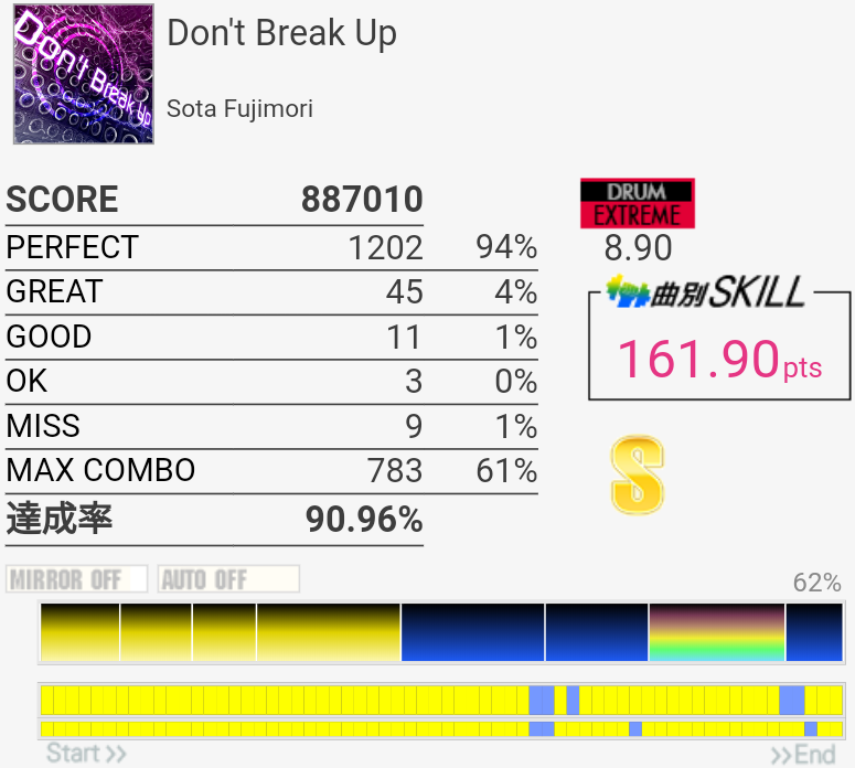 スティック飛ばしたり手はボロボロだったけど足はまあ踏めた。そういう時はなぜかサビ前がシングルで繋がる。