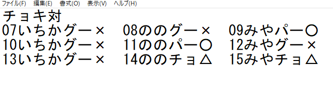 じゃんけん大会、ずっとチョキを出し続けてこんな感じ。もしかして法則性あるのかな?とすると次順はグーグーパーを出してくる……?他にも同じ手を出し続けている人はいてそれだと全然違う結果になっているので人によって法則が違うか、もしくはただの偶然かなんだけど。明日パーを出すか悩む……。