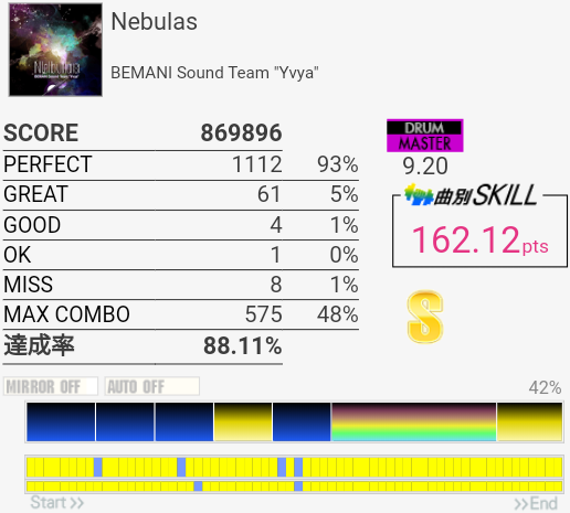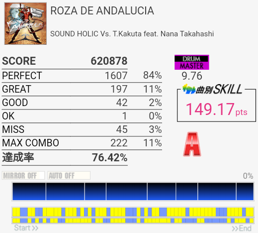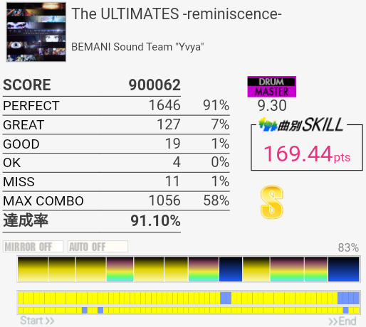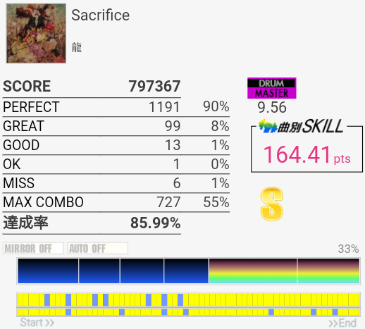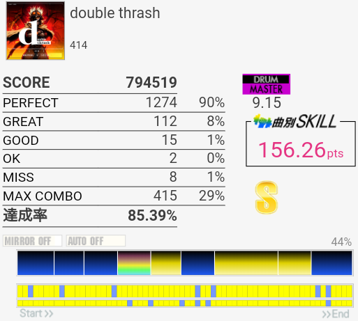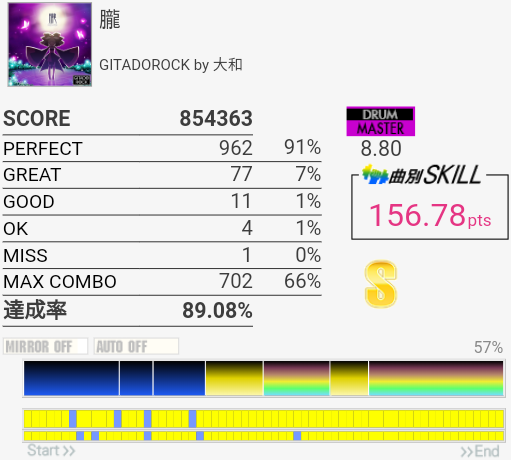 サビ前のSN、HT、LTを凝視しすぎてわけわかんなくなった。あそこは見すぎちゃダメだ……というかリズムを覚えよう。せっかくイントロの8分ツーバスが繋がったのにな。
