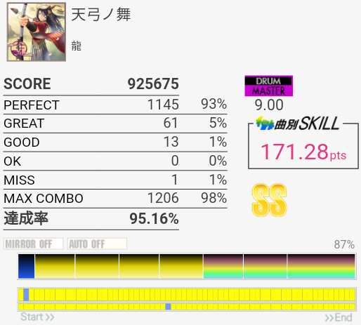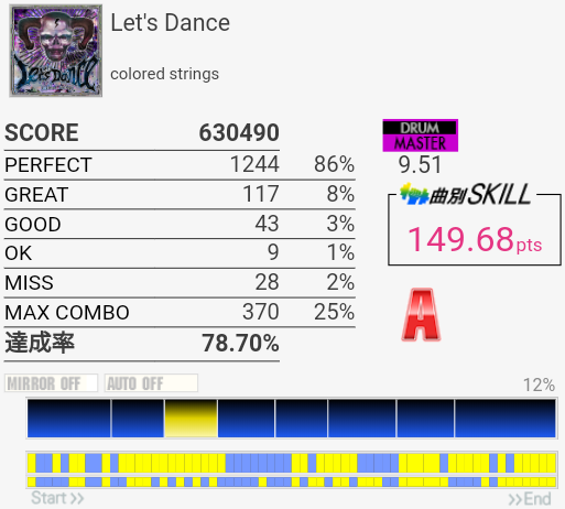 B判定→A判定。なんとなくやりたくなったからやったので全然譜面覚えてなかったけどもうちょいがんばってみてもいいかも。体力を付けたい。