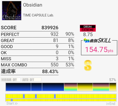 SN×5→SN×3が叩ければ難しいの終盤だけなので伸ばさないと。ちゃんとシングルで取れるようにしたい……。