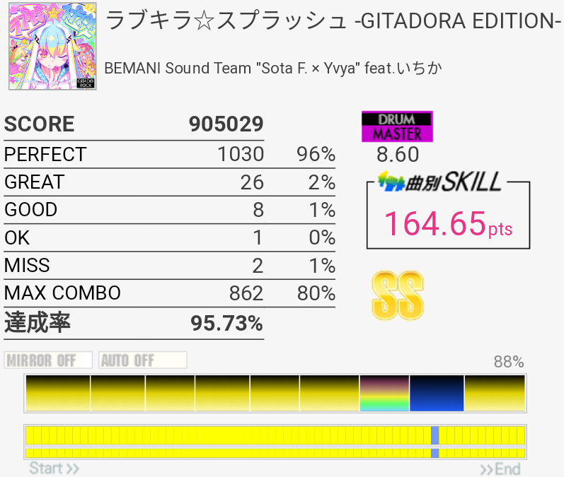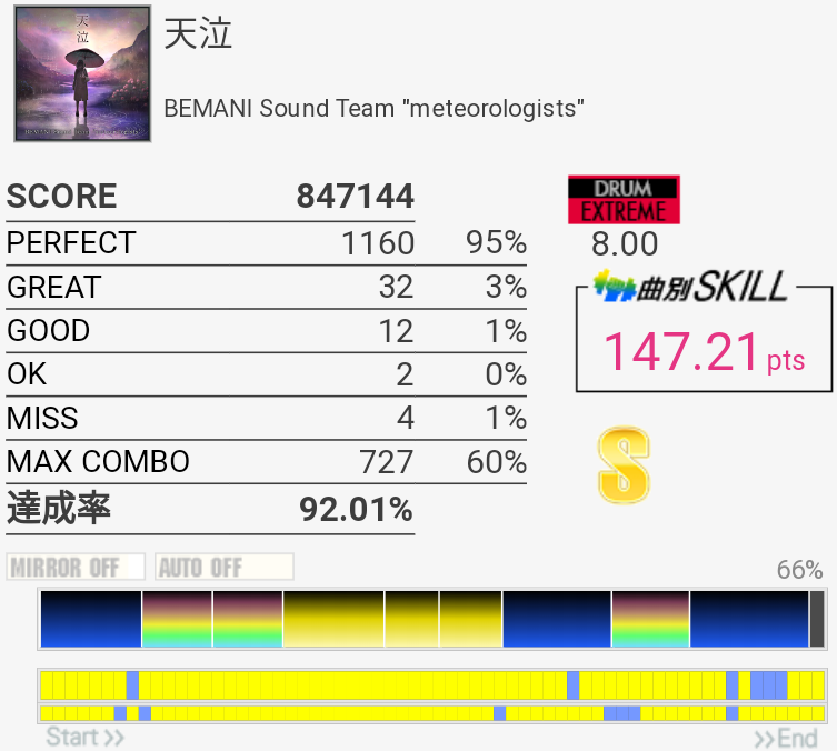 7.50くらいのSota譜面だけどなんでこんな難度値に……まあ譜面自体は良譜面なのでどうでもいいんだけど。やっぱり後半のCY×3が安定して叩けないけど、連打するときに腕が下がって二打目三打目をスティックの腹で叩いちゃうことが多いので、腕を上げて手首を動かす感じを意識したらちょっとやりやすいような……手首が動かないから叩けないんだけど。