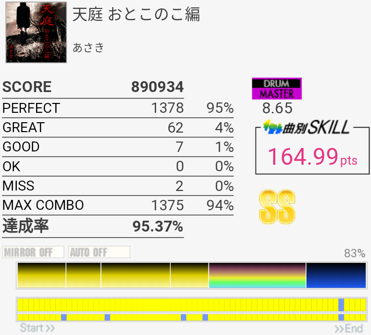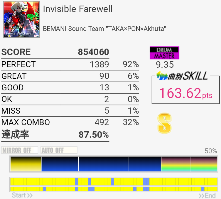 まさかのSS取得。イントロの追い越しタムは叩けてない気がしたのに繋がったからよくわかんなかった。多重反応?サビ前のFTからのSNフラムは左手ダブルでゴリ押した。ラスト切っちゃったのは残念だけど右腕ギリギリだったしSS乗ったからいいかな。