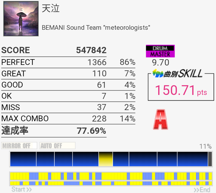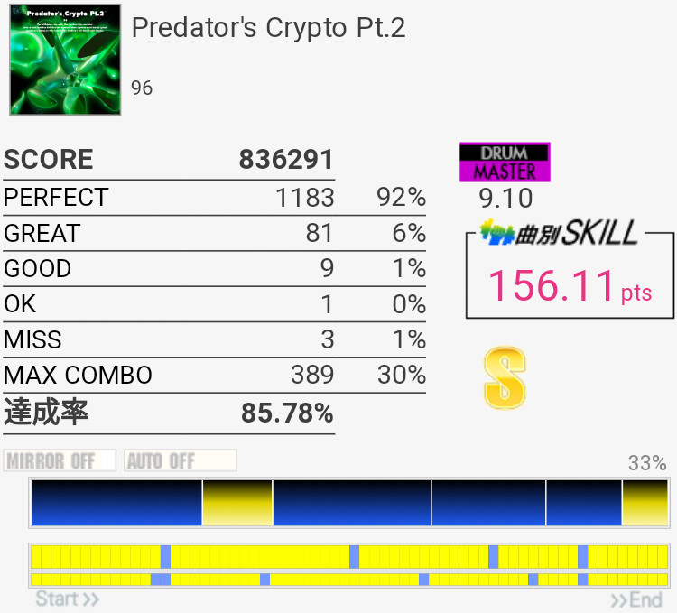 最初周囲がうるさくて曲が全く聴こえなかったので曲調が変わる部分で混乱した。この難度値にしてはかなり良心的だけどAkhuta地帯のSNが左手動かなくて取れないので伸びない。あと交互で叩ける配置なんだけど始まりが32分なせいでよくわからなくなっちゃうのがいやらしい。でも楽しい。